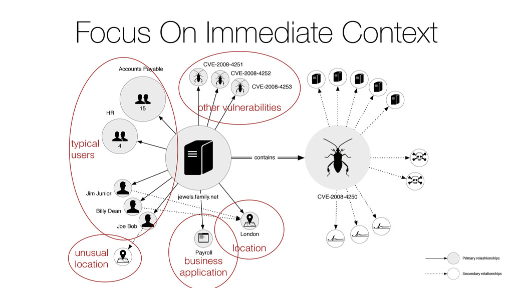 HR jewels.family.net Joe Bob Billy Dean Jim Junior CVE-2008-4250 contains CVE-2008-4251 CVE-2008-4252 CVE-2008-4253 other vulnerabilities typical users business application location unusual location Primary relashionships Secondary relationships