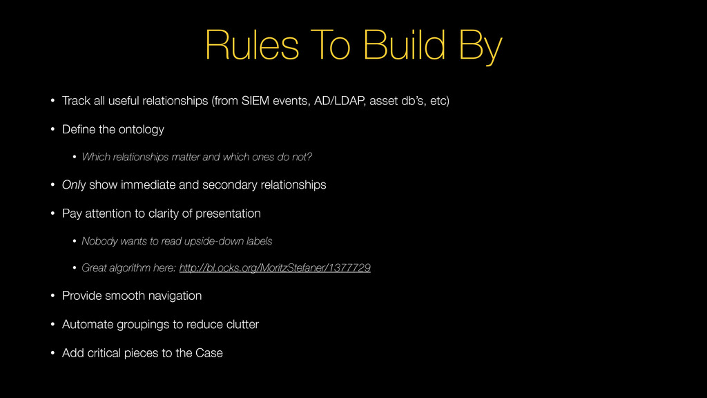 SIEM events, AD/LDAP, asset db’s, etc) • Define the ontology • Which relationships matter and which ones do not? • Only show immediate and secondary relationships • Pay attention to clarity of presentation • Nobody wants to read upside-down labels • Great algorithm here: http://bl.ocks.org/MoritzStefaner/1377729 • Provide smooth navigation • Automate groupings to reduce clutter • Add critical pieces to the Case