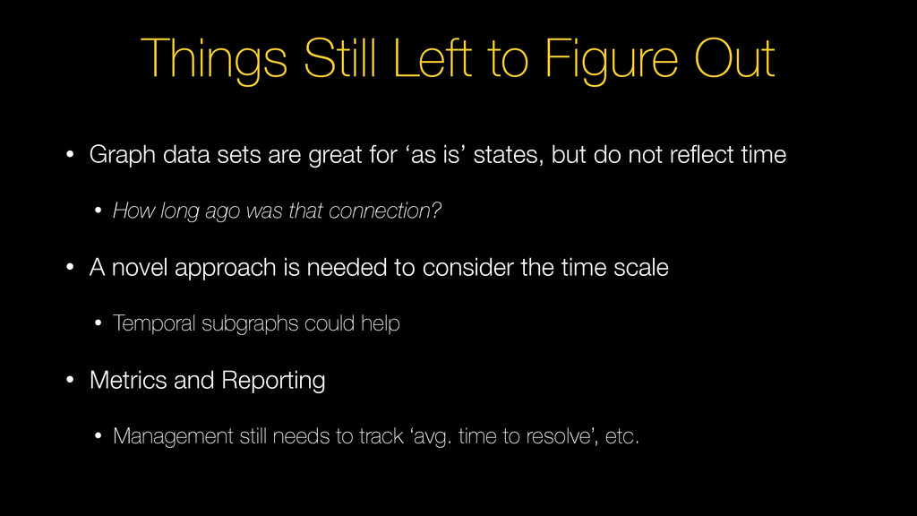 are great for ‘as is’ states, but do not reflect time • How long ago was that connection? • A novel approach is needed to consider the time scale • Temporal subgraphs could help • Metrics and Reporting • Management still needs to track ‘avg. time to resolve’, etc.