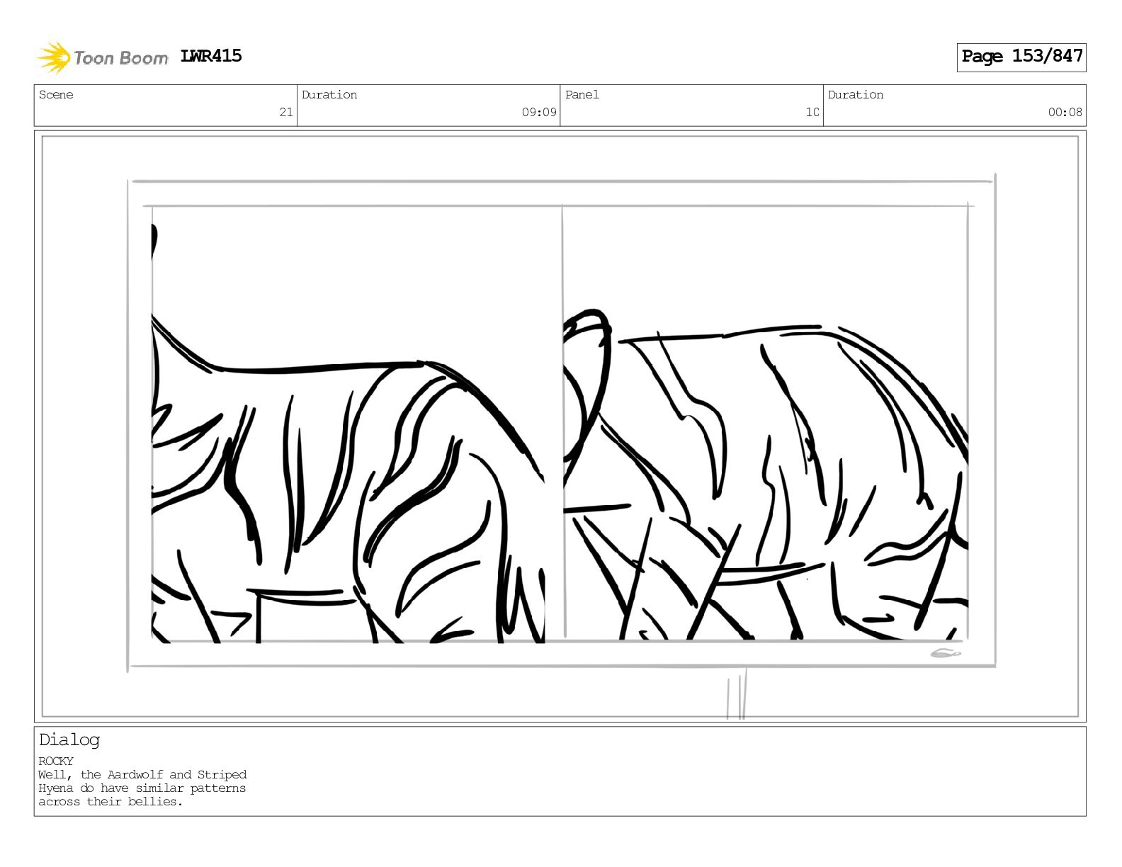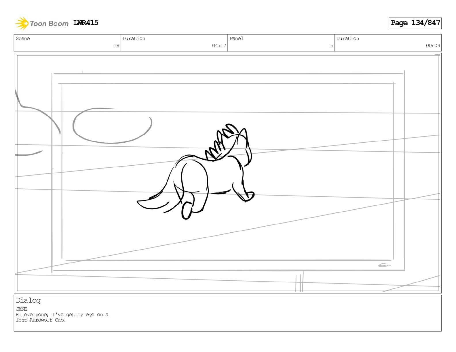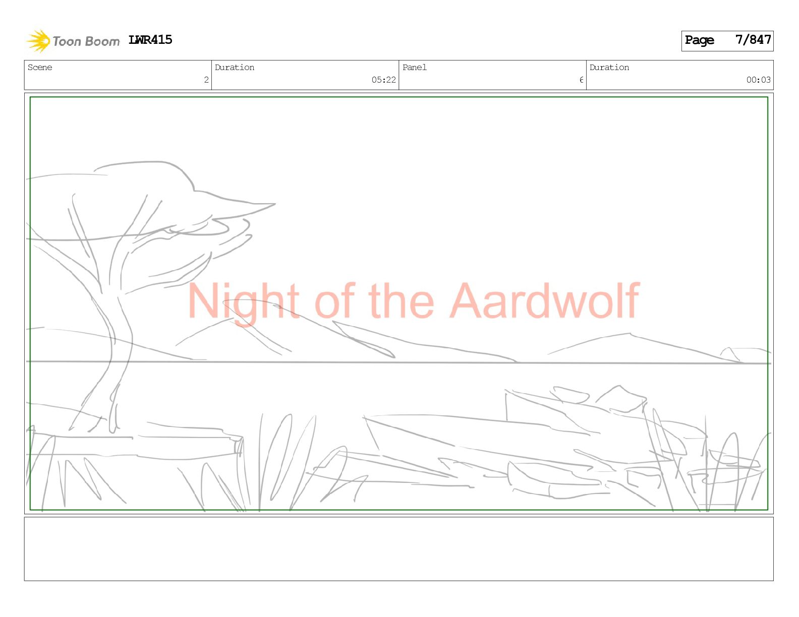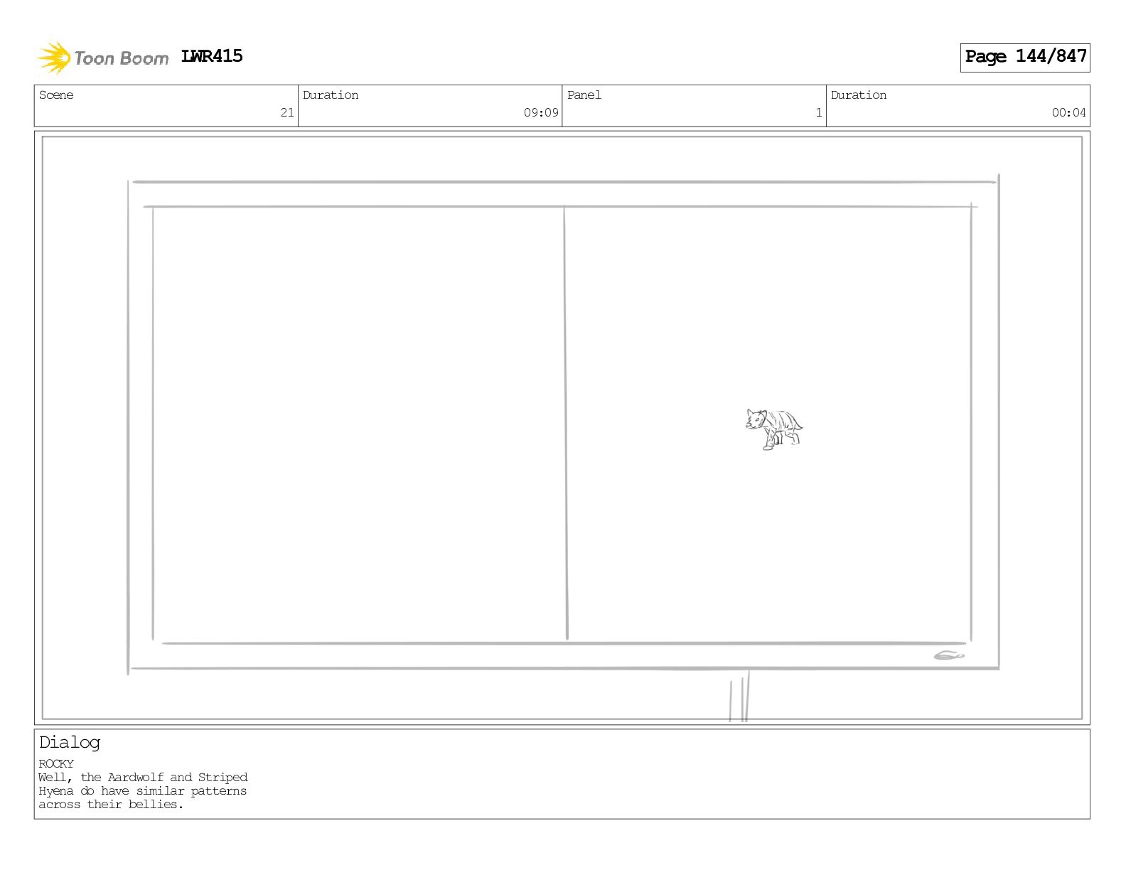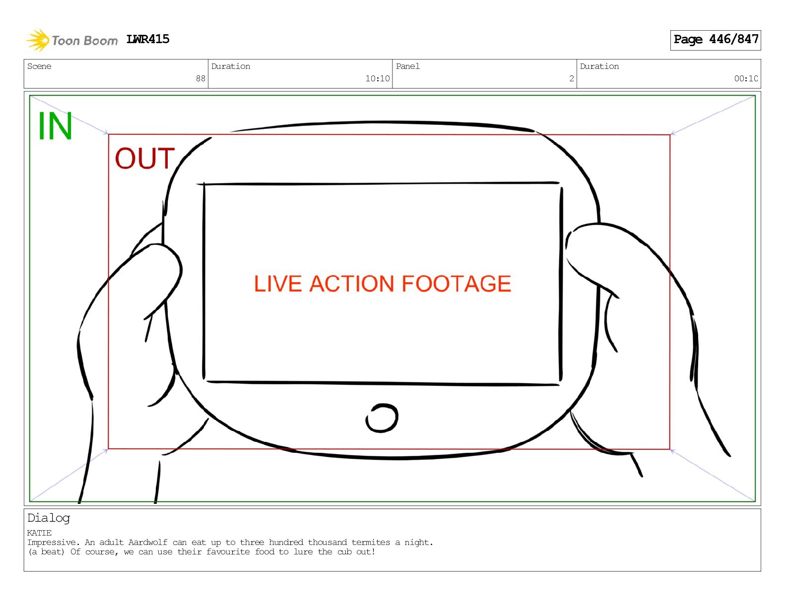 Impressive. An adult Aardwolf can eat up to three hundred thousand termites a night. (a beat) Of course, we can use their favourite food to lure the cub out! LWR415 Page 446/847