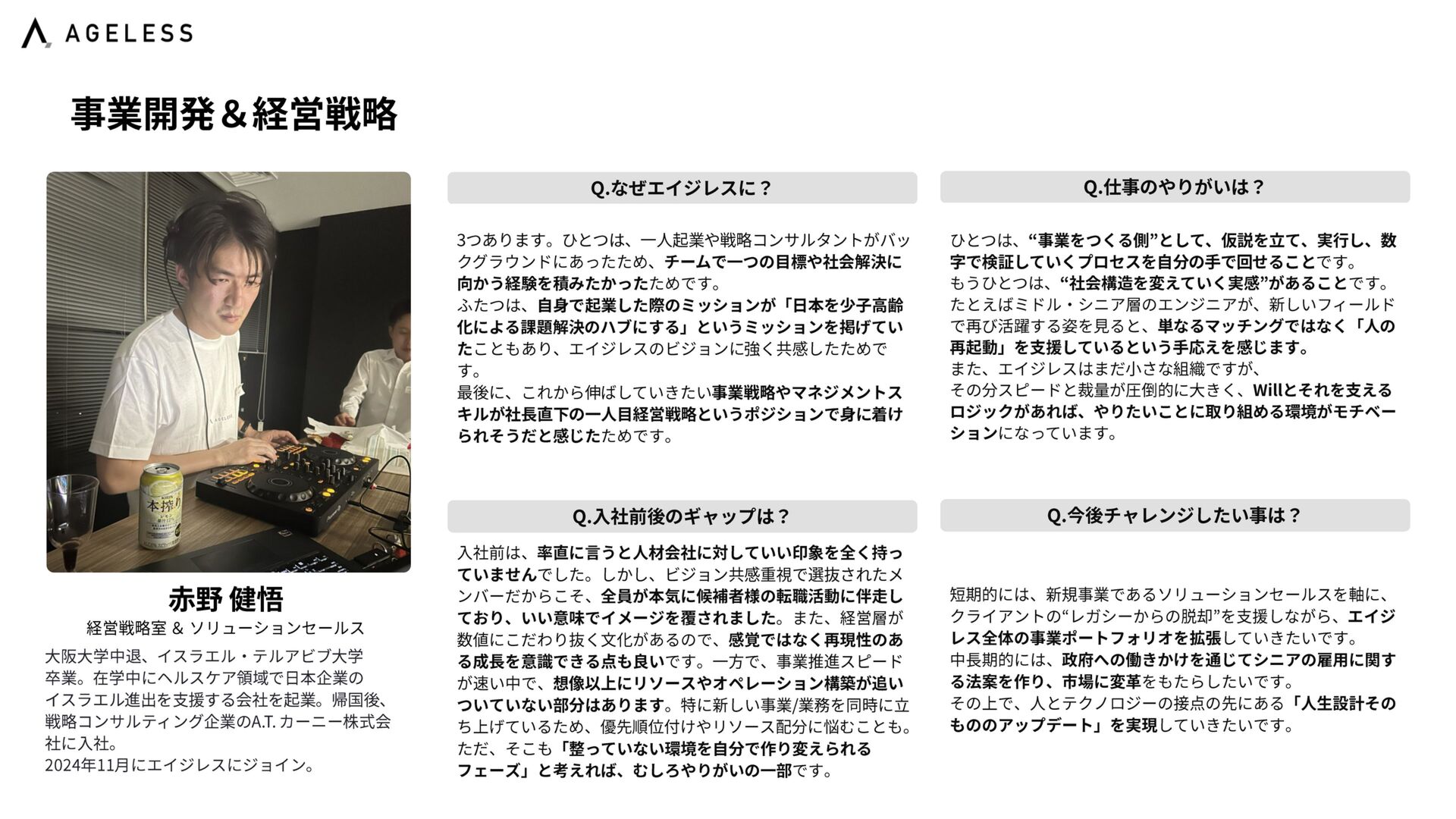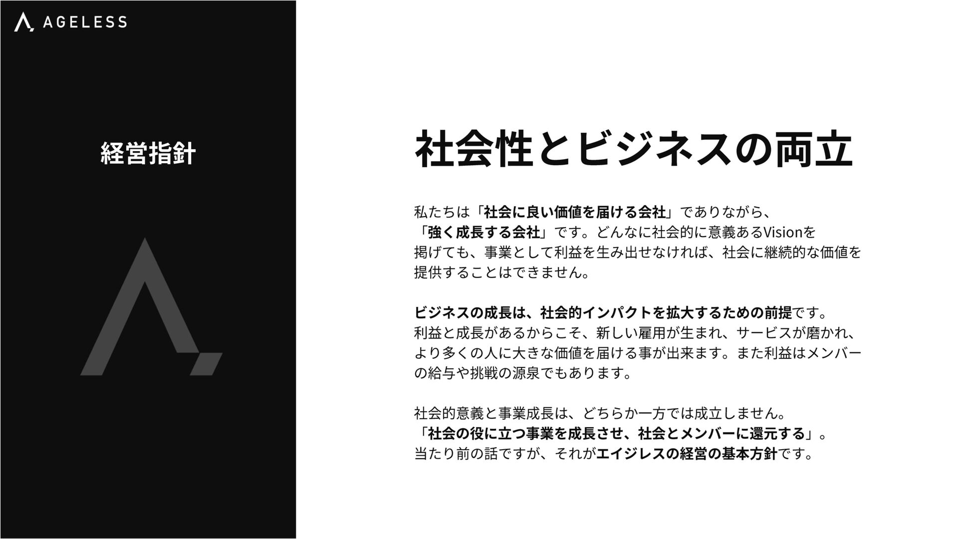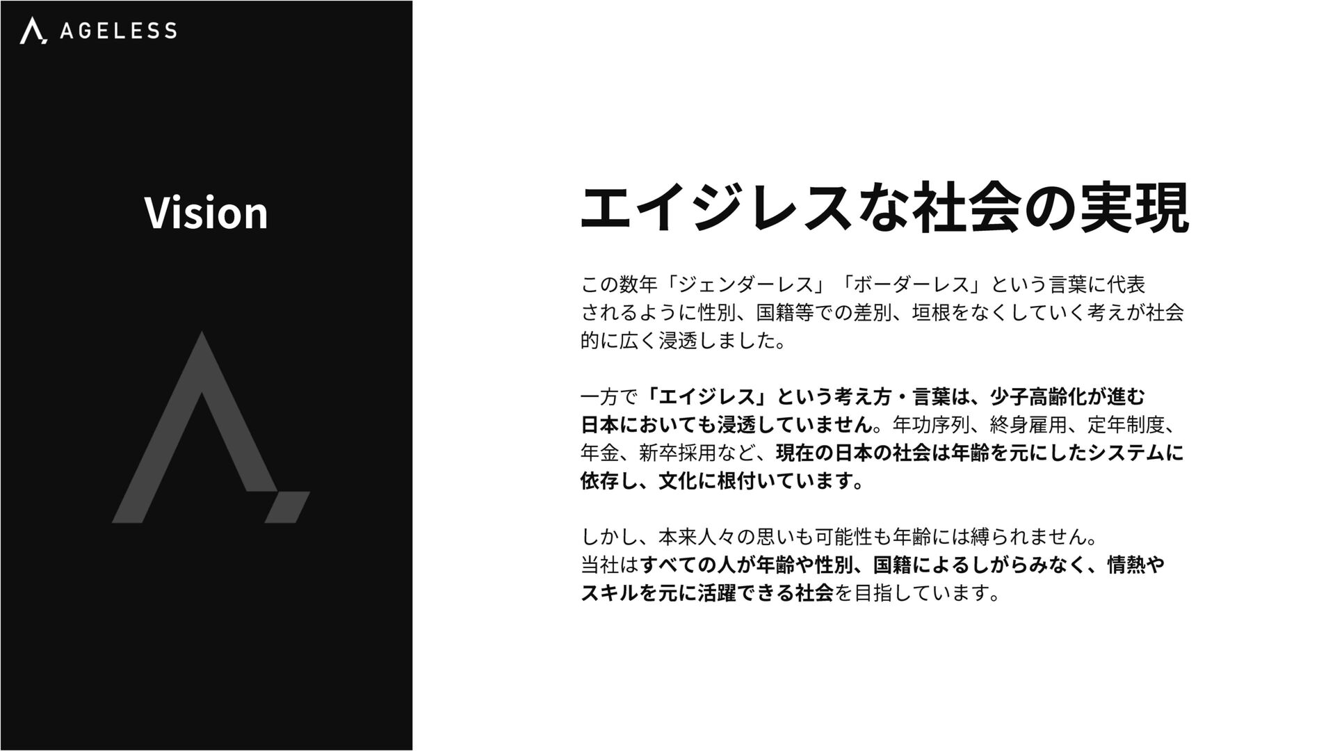 エイジレスのVisionや事業紹介、戦略、オペレーション、カルチャーがまとまった資料になります。