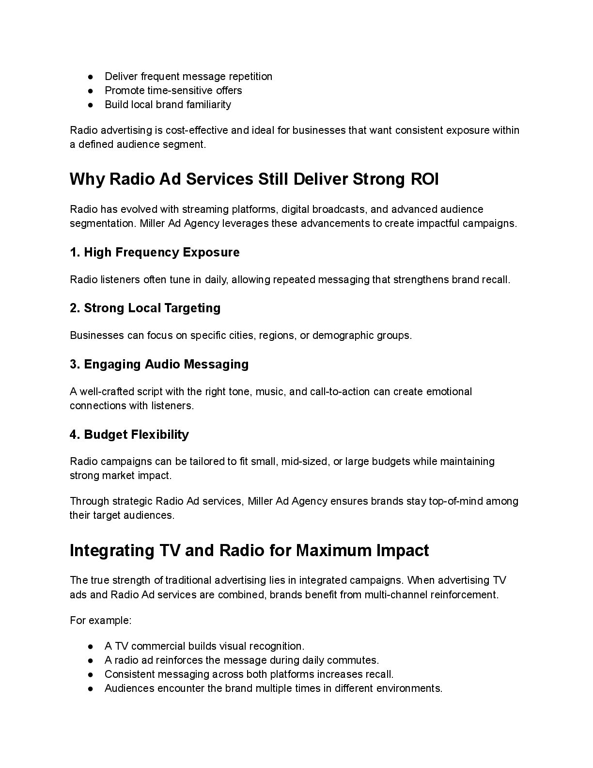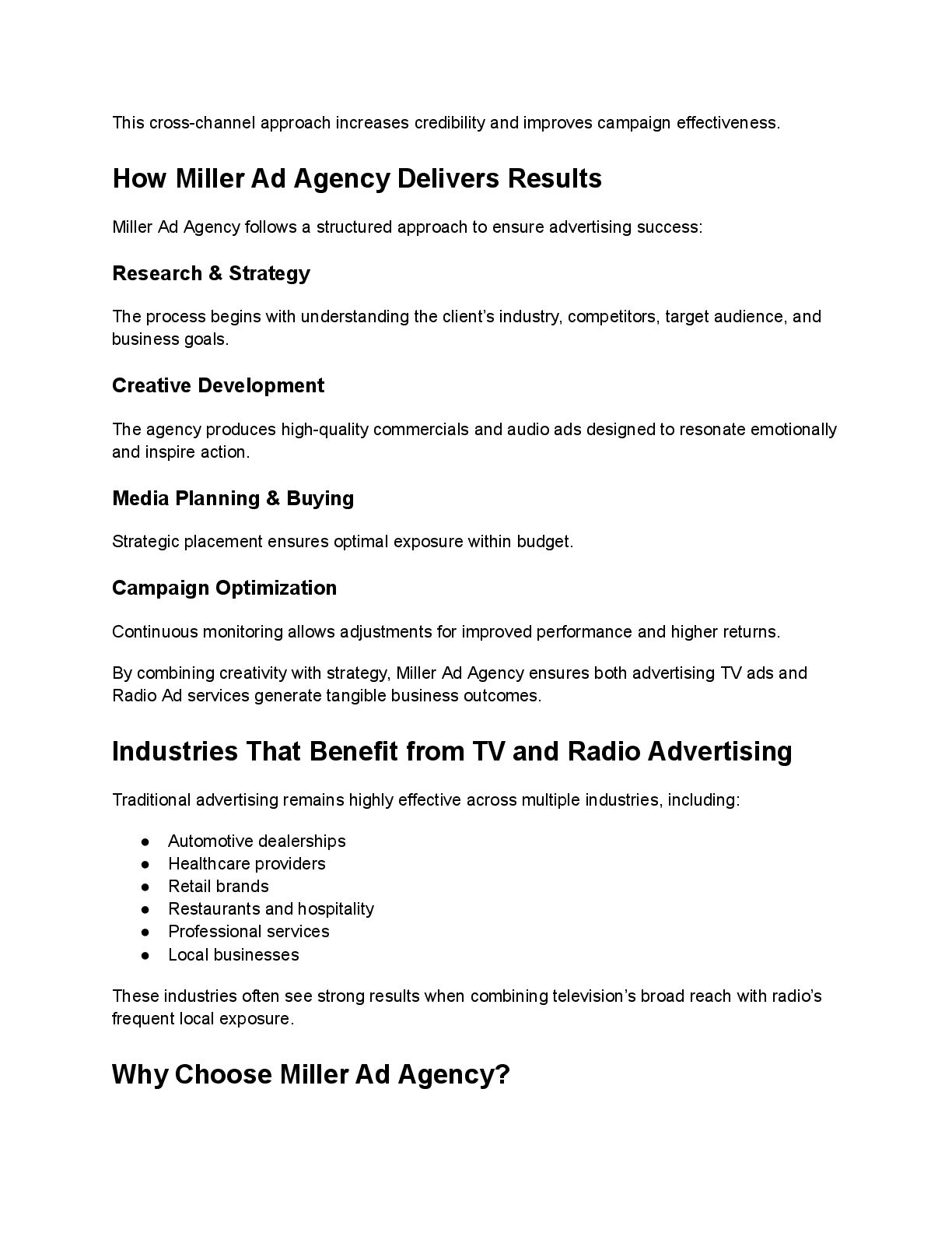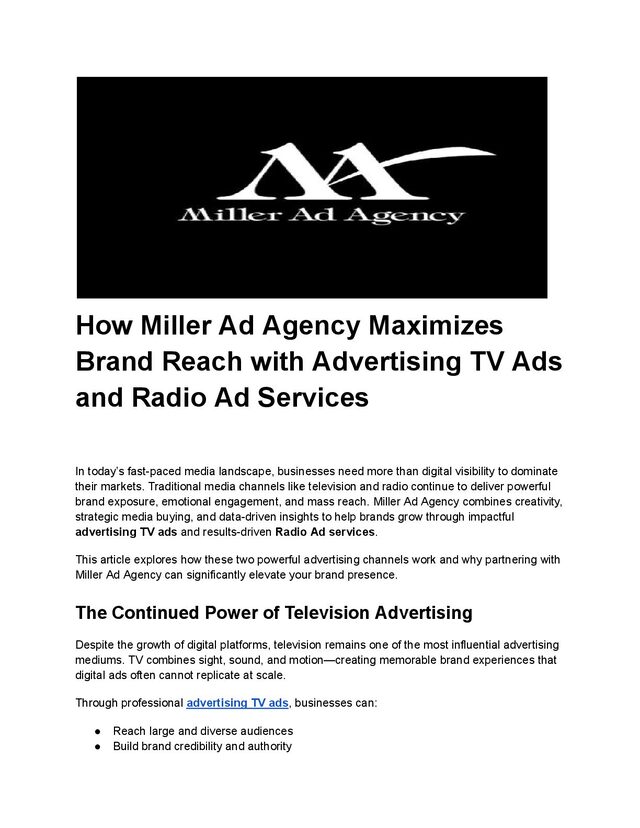 advertising expertise • Integrated marketing strategies • Creative storytelling excellence • Data-driven campaign optimization • Local and national media placement experience The agency understands that effective advertising requires both art and science. By blending emotional storytelling with performance analytics, Miller Ad Agency helps businesses build strong brand equity and long-term growth. The Future of Traditional Advertising While digital marketing continues to grow, television and radio remain powerful tools in a balanced marketing strategy. In fact, many brands see the best results when traditional and digital efforts complement one another. Television builds awareness at scale. Radio reinforces messaging locally. Digital platforms capture and convert interested prospects. Miller Ad Agency helps businesses integrate these channels seamlessly for maximum impact. Final Thoughts Strong brands are built through consistent visibility, emotional engagement, and strategic placement. Through expert advertising TV ads and targeted Radio Ad services, Miller Ad Agency empowers businesses to expand their reach, strengthen brand recognition, and drive measurable growth. If your business is ready to leverage the full potential of television and radio advertising, partnering with Miller Ad Agency can help transform your message into powerful, results-driven campaigns.
