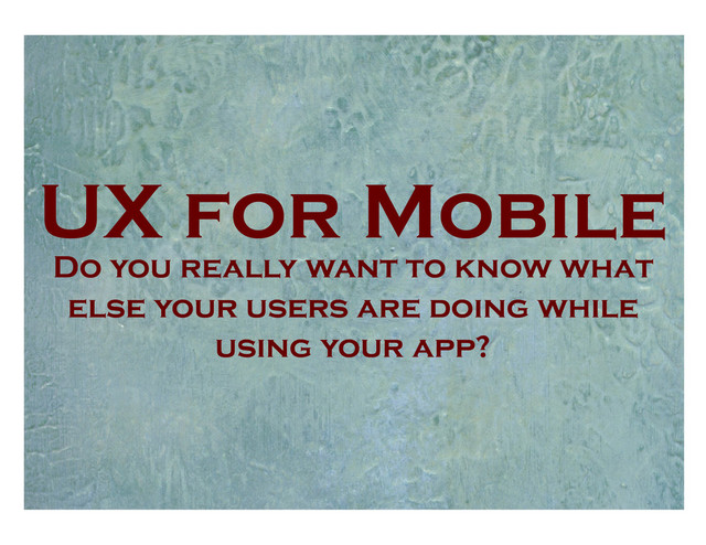 So, you're company is going mobile. It's going to happen if you plan for it or don't. Users are no longer waiting to get home to their computer, and you might be surprised where they are when they land on your site. So what does this mean? And if you're working to solve a problem from scratch, what does "UX thinking" really mean for you? Presented at SF East Bay New Tech, April 2012. http://www.meetup.com/EBNewTech/