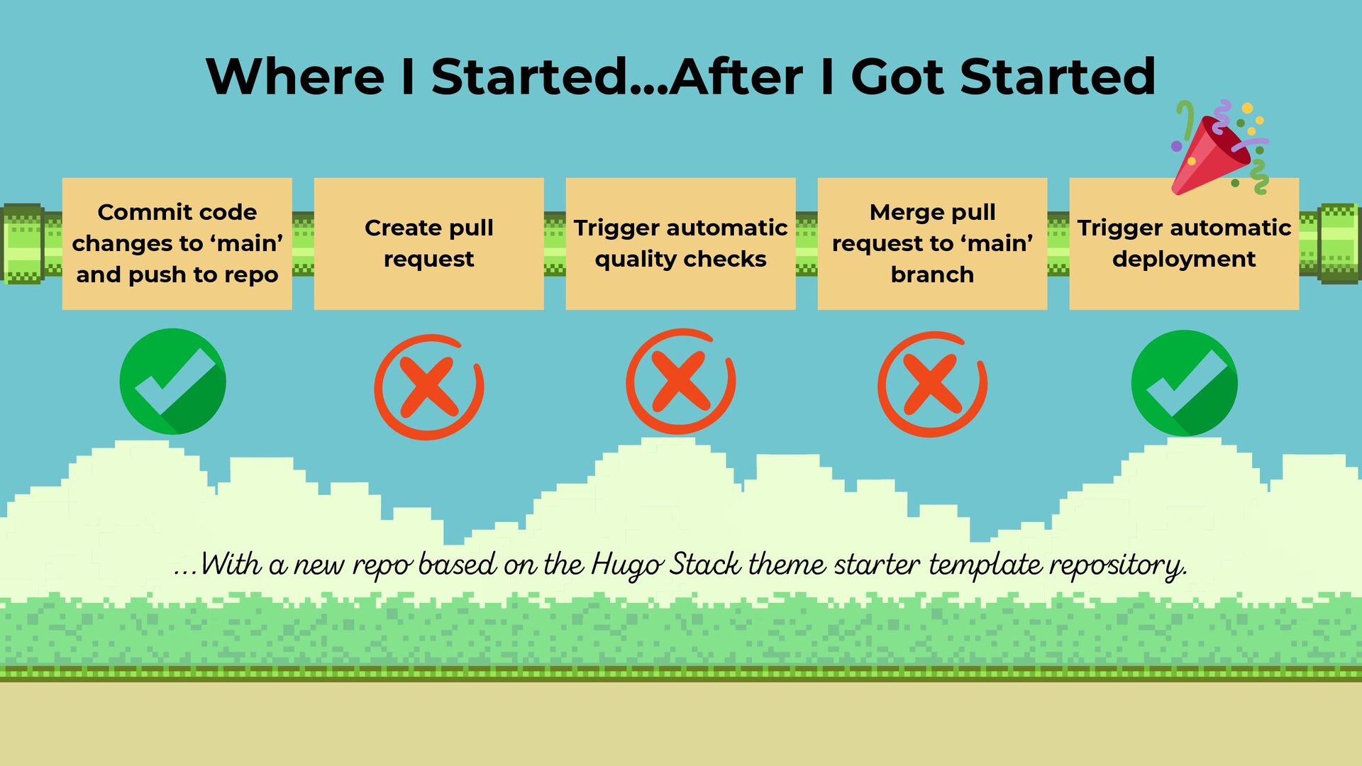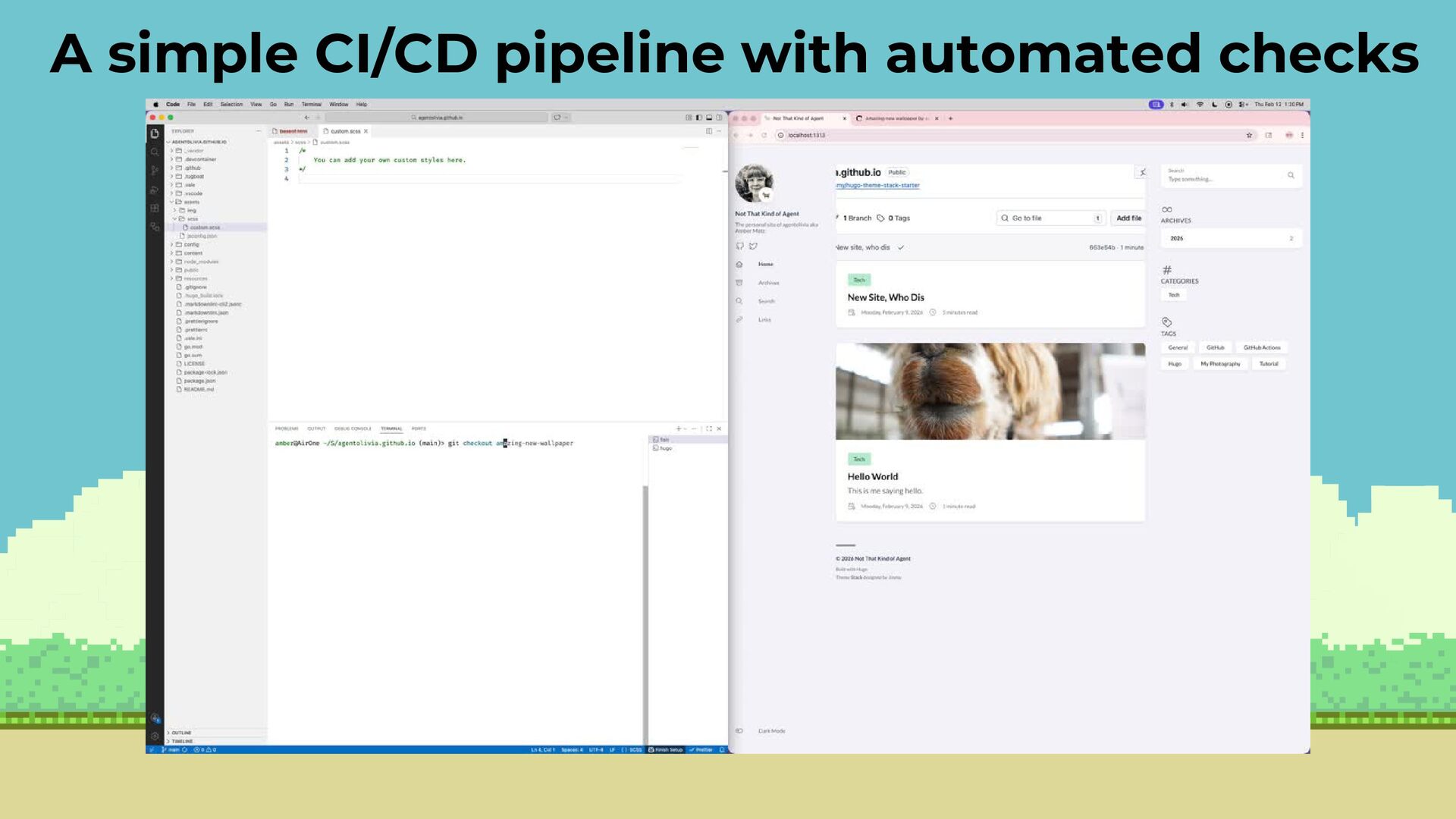 How do you learn how CI/CD pipelines work when your workplace systems feel too complex or risky to experiment with? When I pivoted from creating Drupal tutorials into the DevOps and QA space, I needed a safe, low-stakes environment to understand how automated workflows really function. So I built a small personal playground: a Hugo-powered blog, stored in a GitHub repository and published through GitHub Pages. From there, I began adding the QA tools I was used to using at work to see how they could run automatically in my personal deployment pipeline. That hands-on exploration helped me understand more complex DevOps workflows and gave me ownership of quality checks for my own site.