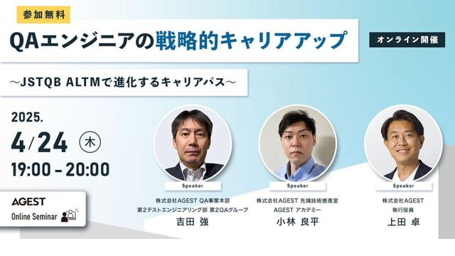 経歴 QA経験 約10年 Web/モバイル系 テスト管理、テスト計画~テスト実施 テスト推進、テスト改善、プロセス改善 業務系・金融系システムなどのテスト業務全般に従事 2022年にAGESTへ入社し、AGEST アカデミーへジ ョイン。テスト業務に関する研究開発に取り組むとと もに、若手人材の育成に携わる。現在は、教育推進を 担う講師として、現場の品質向上に貢献。 小林 良平 Ryohei Kobayashi AGEST 先端技術推進室 AGEST アカデミー