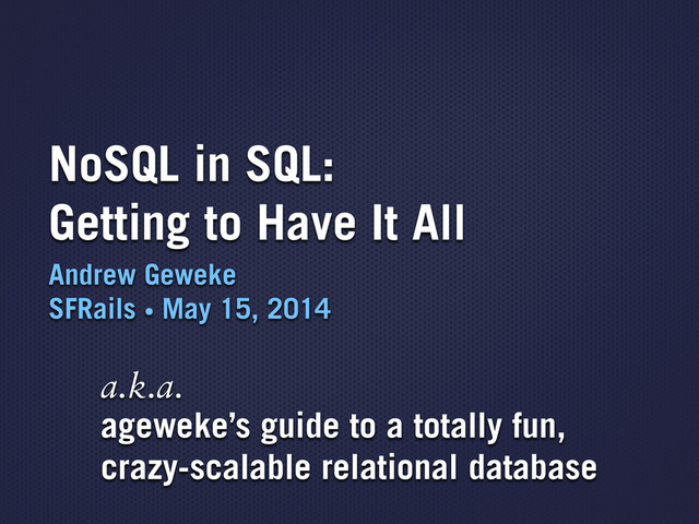 Three techniques that work together to make your Ruby on Rails application use a relational database with much of the power and expressivity as a NoSQL store, while maintaining the robustness, operational flexibility, and robust ecosystem of a relational database. Given at SFRails, May 15, 2014: http://www.meetup.com/SFRails/events/167606272/.