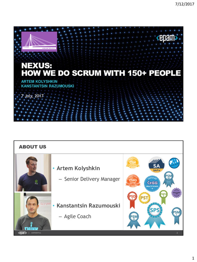 Nexus is a framework for scaled Scrum developed by Scrum co-creator Ken Schwaber and Scrum.org community. It addresses the most painful problems of scaled development – dealing with dependencies and building 'Done' integrated software every iteration. In our short talk, we are going to explain the key concepts of Nexus and illustrate them with our own case study where 150+ people successfully do Scrum to build software for a big North American retail company using Nexus.