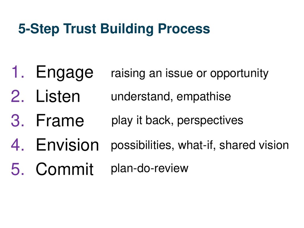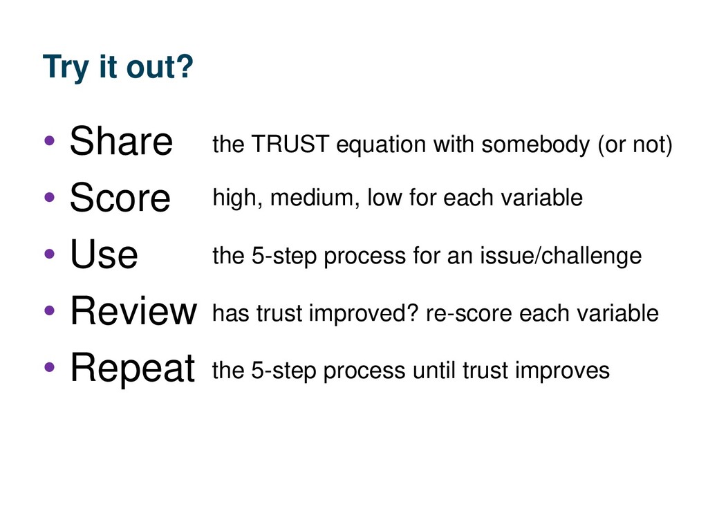 Review • Repeat the TRUST equation with somebody (or not) the 5-step process for an issue/challenge the 5-step process until trust improves high, medium, low for each variable has trust improved? re-score each variable