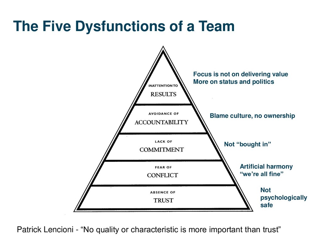 quality or characteristic is more important than trust” Artificial harmony “we’re all fine” Not psychologically safe Not “bought in” Focus is not on delivering value More on status and politics Blame culture, no ownership