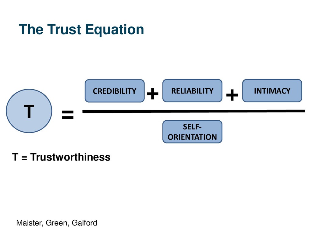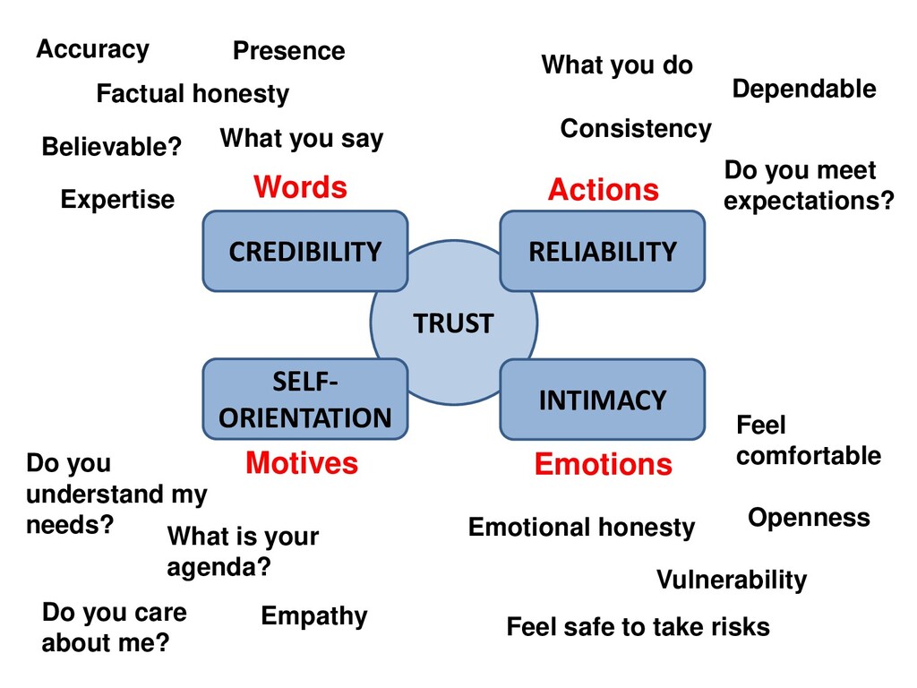 Actions Consistency Dependable Do you meet expectations? Emotions Vulnerability Factual honesty Openness Feel comfortable Motives Empathy What is your agenda? Do you care about me? Do you understand my needs? Accuracy What you say What you do Emotional honesty Feel safe to take risks