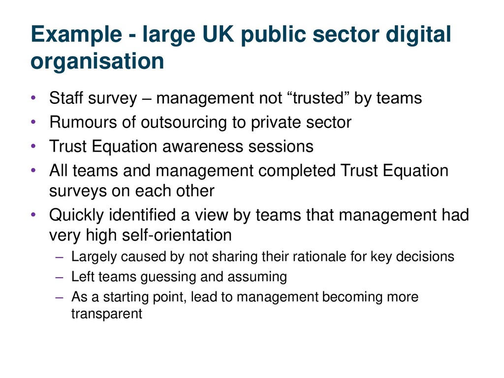 survey – management not “trusted” by teams • Rumours of outsourcing to private sector • Trust Equation awareness sessions • All teams and management completed Trust Equation surveys on each other • Quickly identified a view by teams that management had very high self-orientation – Largely caused by not sharing their rationale for key decisions – Left teams guessing and assuming – As a starting point, lead to management becoming more transparent