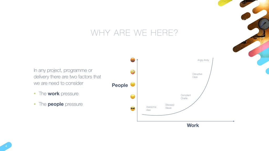 delivery there are two factors that we are need to consider • The work pressure • The people pressure People Work Awesome Alex Stressed Stevie Compliant Charlie Disruptive Dave Angry Andy