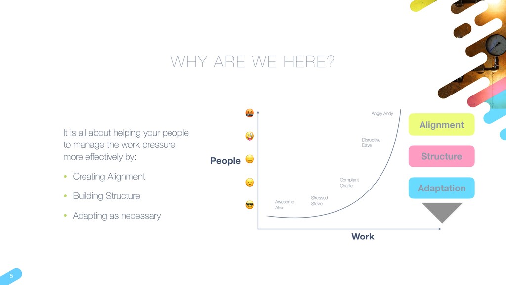 your people to manage the work pressure more effectively by: • Creating Alignment • Building Structure • Adapting as necessary People Work Awesome Alex Stressed Stevie Compliant Charlie Disruptive Dave Angry Andy Structure Alignment Adaptation