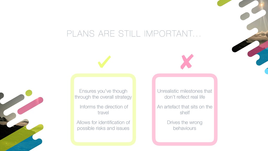 strategy Informs the direction of travel Allows for identification of possible risks and issues Unrealistic milestones that don’t reflect real life An artefact that sits on the shelf Drives the wrong behaviours
