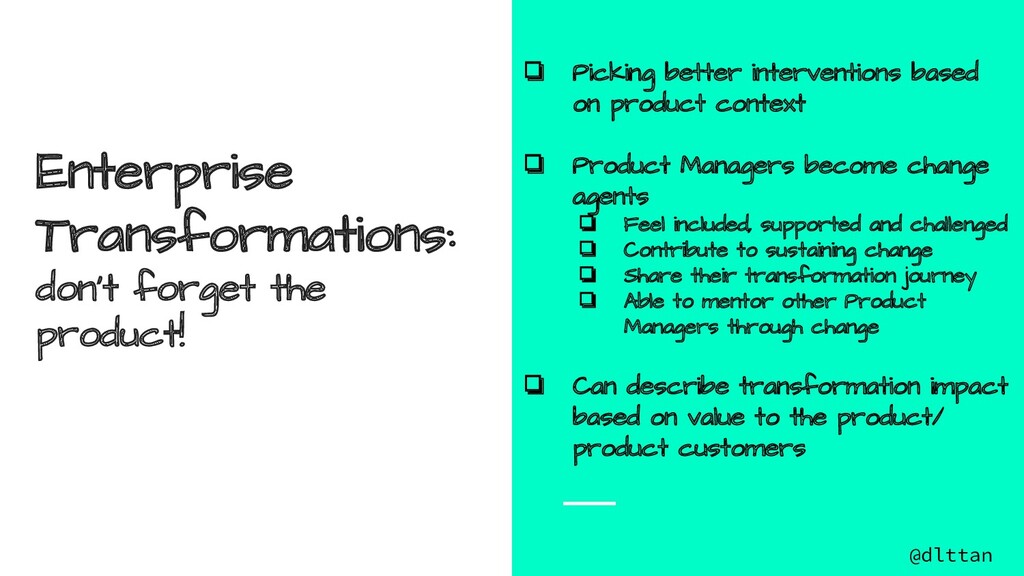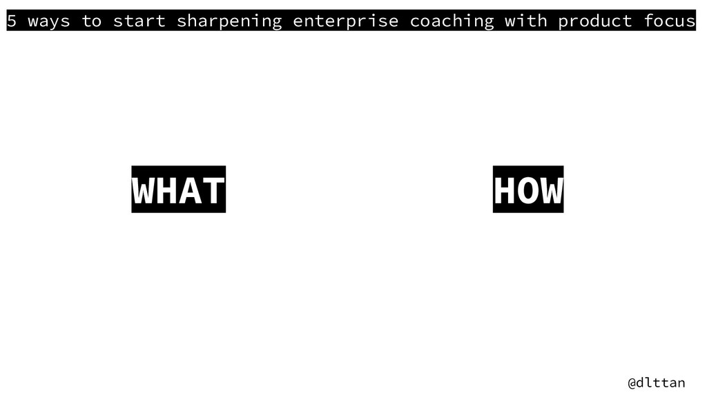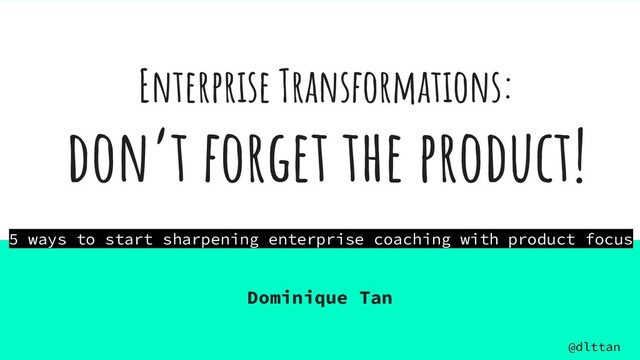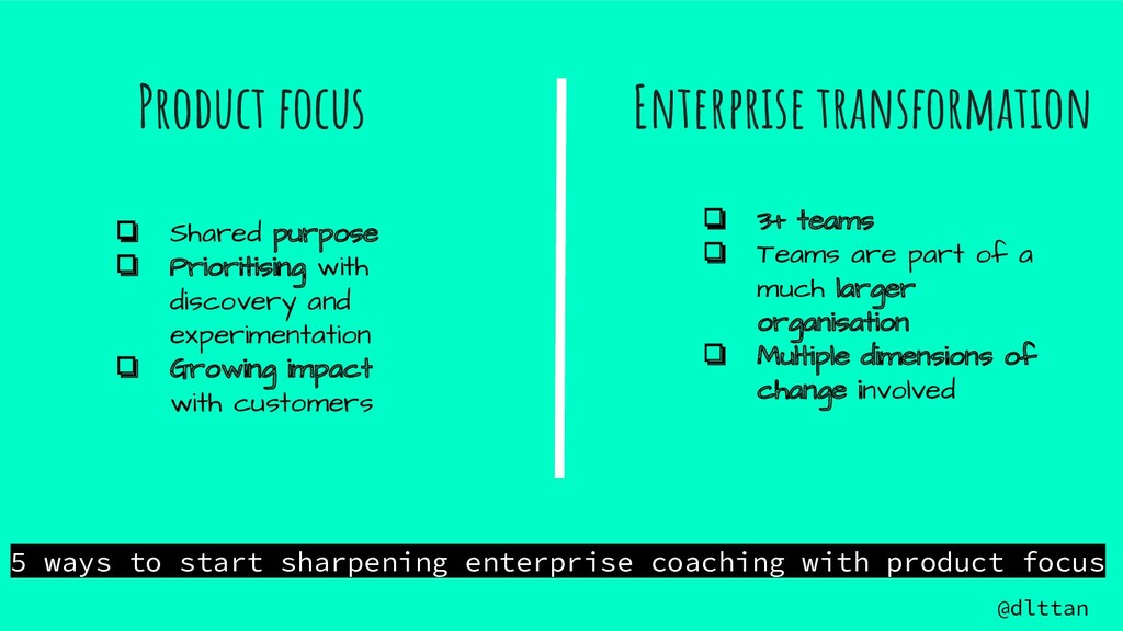 a much larger organisation ❏ Multiple dimensions of change involved Product focus ❏ Shared purpose ❏ Prioritising with discovery and experimentation ❏ Growing impact with customers 5 ways to start sharpening enterprise coaching with product focus @dlttan