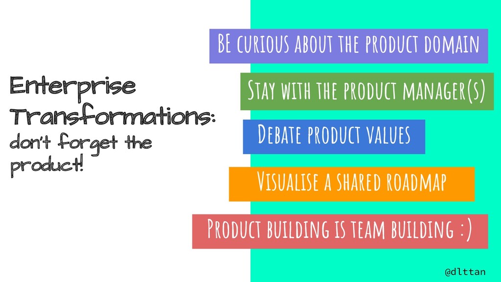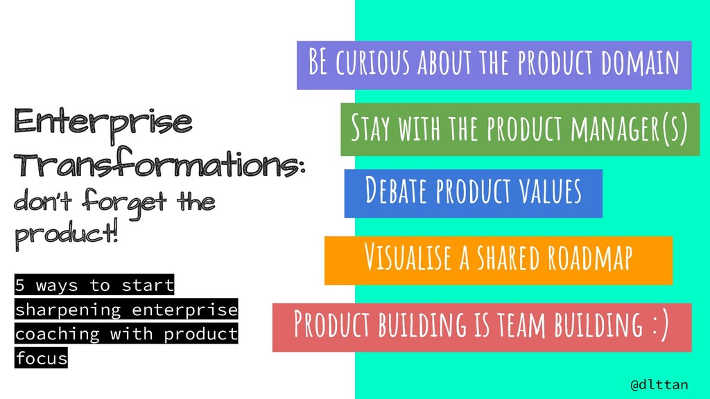 product domain Stay with the product manager(s) Visualise a shared roadmap Debate product values Product building is team building :) 5 ways to start sharpening enterprise coaching with product focus @dlttan