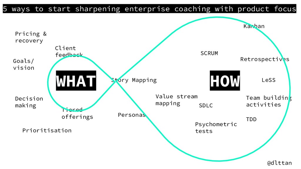 Team building activities 5 ways to start sharpening enterprise coaching with product focus TDD LeSS SDLC Goals/ vision Decision making Client feedback Tiered offerings Prioritisation Pricing & recovery Story Mapping Personas @dlttan