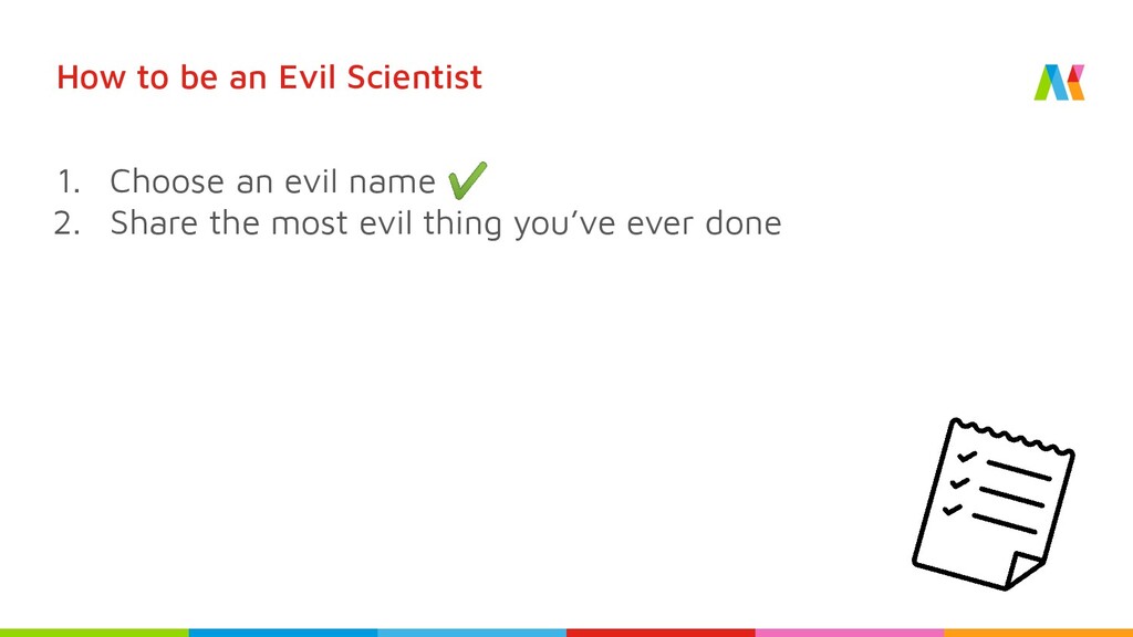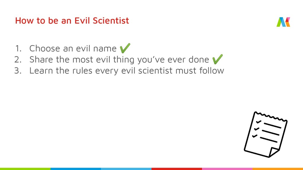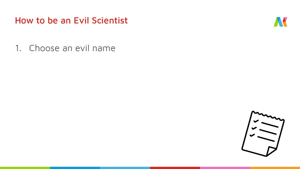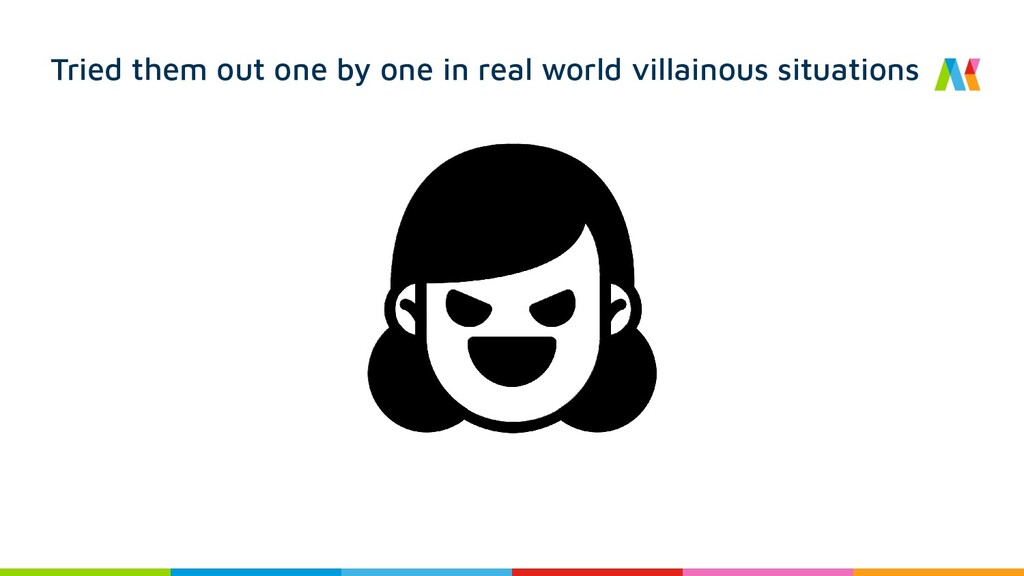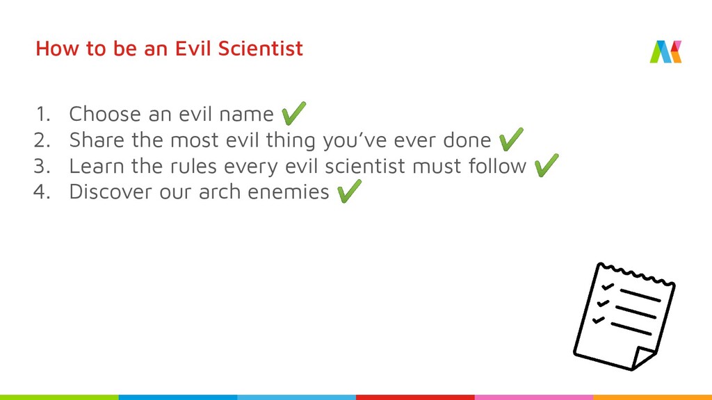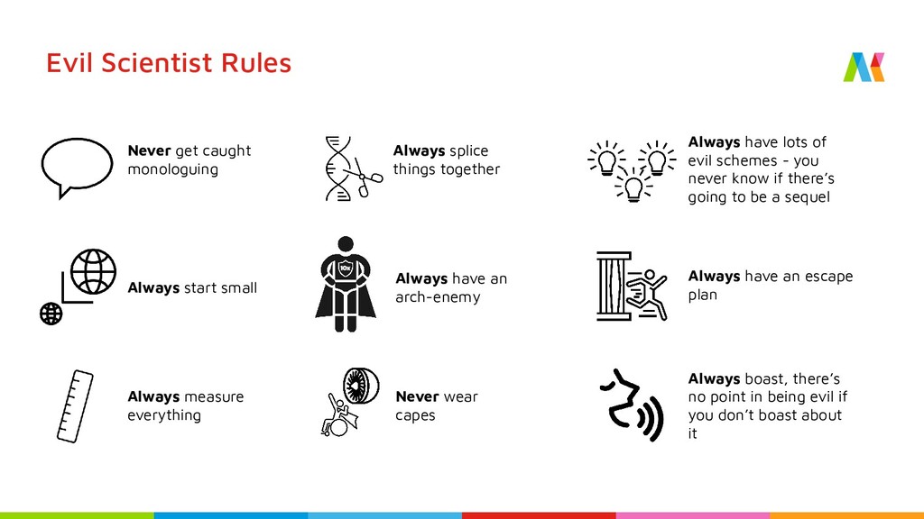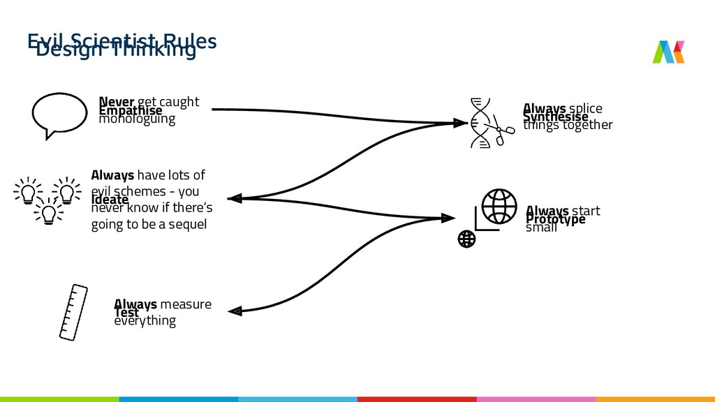 evil schemes - you never know if there’s going to be a sequel Always start small Never get caught monologuing Always measure everything Always splice things together Ideate Prototype Test Synthesise