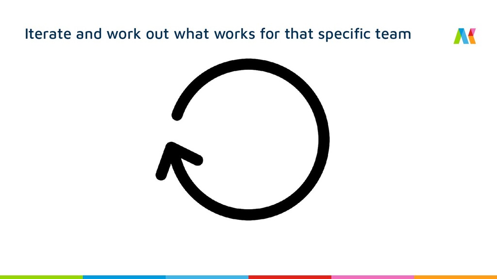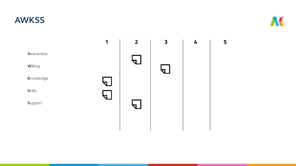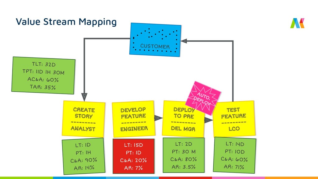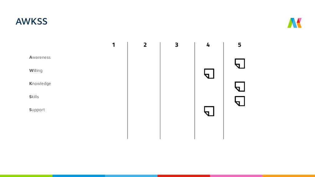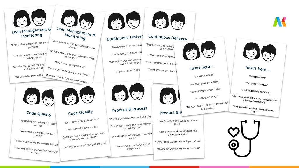 “Commit to VCS and the customers have it in seconds” “Anyone can do a deploy!” Continuous Delivery Continuous Delivery “Deployment Joe is the only one who can do that” “That’s the security team’s job” “The customers get it a quarter later” “Only some people can deploy” “We find out direct from our users by... “Our kanban board shows all the work, and where it is” “Our stories usually last no than half a sprint” "We weren’t sure so we ran an experiment” Product & Process Product & Process “I don’t really know what our users think” “Sometimes work comes from the backlog except...” “Sometimes stories last multiple sprints” “That’s the way we’ve always done it” Insert here.... “Good statement” “Another good statement” “Good thing number three” “Fourth good thing” “Number five in the list of things that are good...” Insert here.... “Rather than a sign off process we pair program” “The app gathers metrics and decide what’s next” “Our checks spotted the problem before our customers DID” “We only take on one thing at a time” Lean Management & Monitoring Lean Management & Monitoring “Oh we need to wait for CAB before we release” “No idea how the business decides what to do next” “The customer reported it” “We’re constantly doing 7 or 8 things” “It was a week before we even noticed” Code Quality “Absolutely everything is in source control” “We automatically test on every commit” “There’s only really the master branch” “I can add as many or as few examples as I need” Code Quality “It’s in source control except...” “We manually have a look” “Our branches are around forever and there are loads of them” “...but the data wasn’t like that on prod”