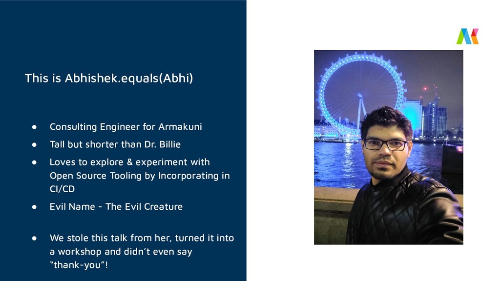 but shorter than Dr. Billie • Loves to explore & experiment with Open Source Tooling by Incorporating in CI/CD • Evil Name - The Evil Creature • We stole this talk from her, turned it into a workshop and didn’t even say “thank-you”!