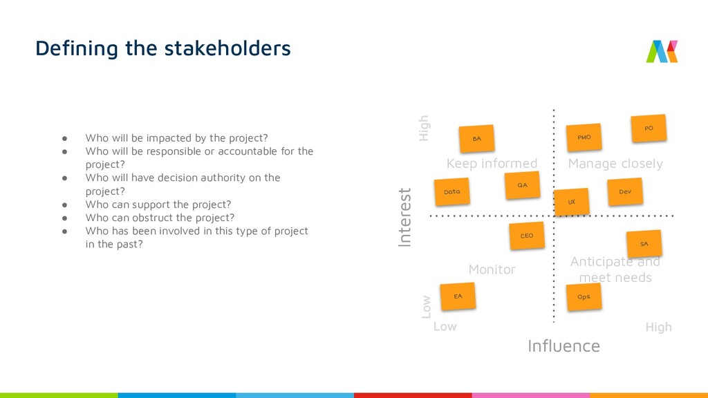 project? • Who will be responsible or accountable for the project? • Who will have decision authority on the project? • Who can support the project? • Who can obstruct the project? • Who has been involved in this type of project in the past? Keep informed Manage closely Monitor Anticipate and meet needs PMO CEO SA Ops Data PO BA UX EA Dev QA