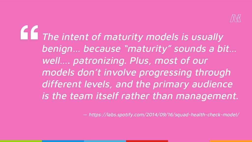 sounds a bit… well…. patronizing. Plus, most of our models don’t involve progressing through different levels, and the primary audience is the team itself rather than management. — https://labs.spotify.com/2014/09/16/squad-health-check-model/
