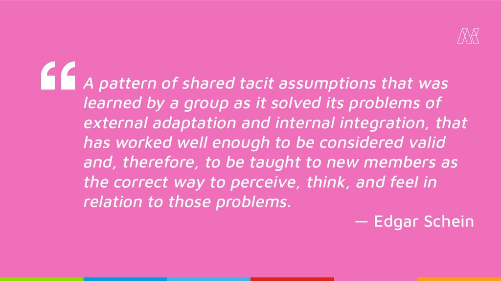 a group as it solved its problems of external adaptation and internal integration, that has worked well enough to be considered valid and, therefore, to be taught to new members as the correct way to perceive, think, and feel in relation to those problems. — Edgar Schein