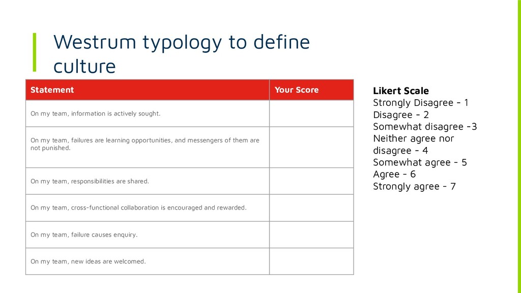 team, information is actively sought. On my team, failures are learning opportunities, and messengers of them are not punished. On my team, responsibilities are shared. On my team, cross-functional collaboration is encouraged and rewarded. On my team, failure causes enquiry. On my team, new ideas are welcomed. Likert Scale Strongly Disagree - 1 Disagree - 2 Somewhat disagree -3 Neither agree nor disagree - 4 Somewhat agree - 5 Agree - 6 Strongly agree - 7