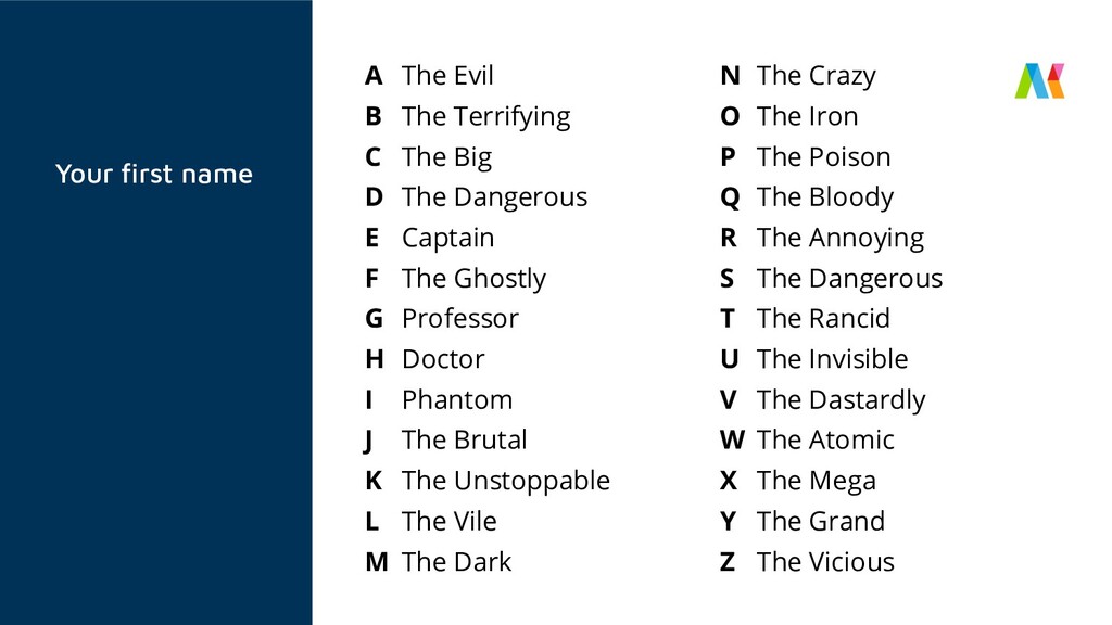 The Terrifying O The Iron C The Big P The Poison D The Dangerous Q The Bloody E Captain R The Annoying F The Ghostly S The Dangerous G Professor T The Rancid H Doctor U The Invisible I Phantom V The Dastardly J The Brutal W The Atomic K The Unstoppable X The Mega L The Vile Y The Grand M The Dark Z The Vicious
