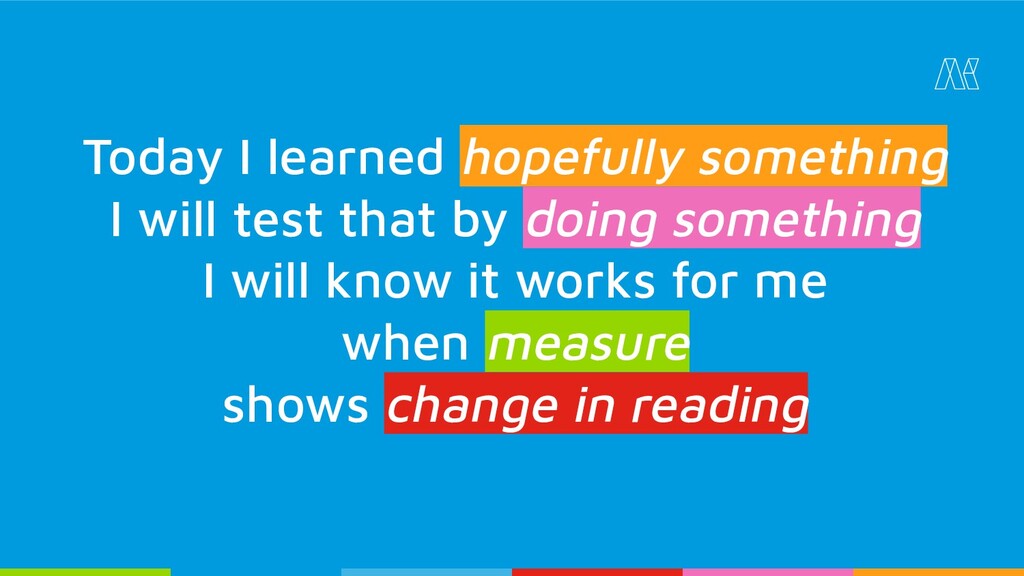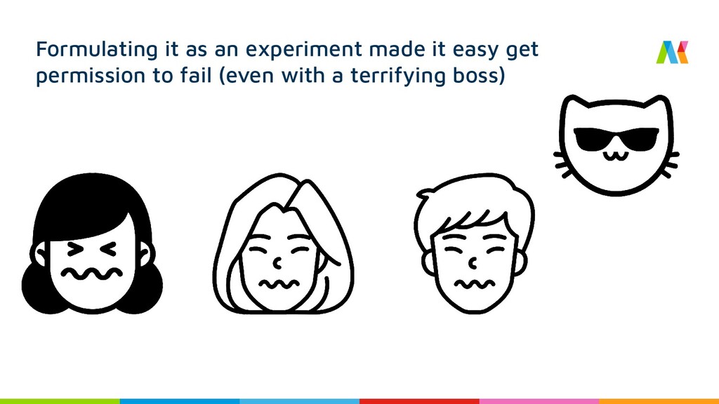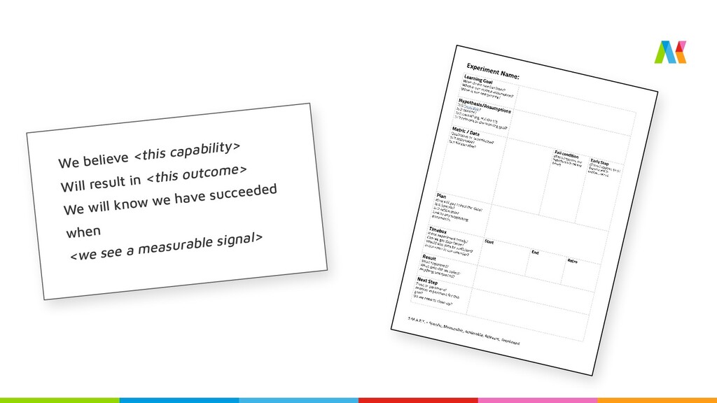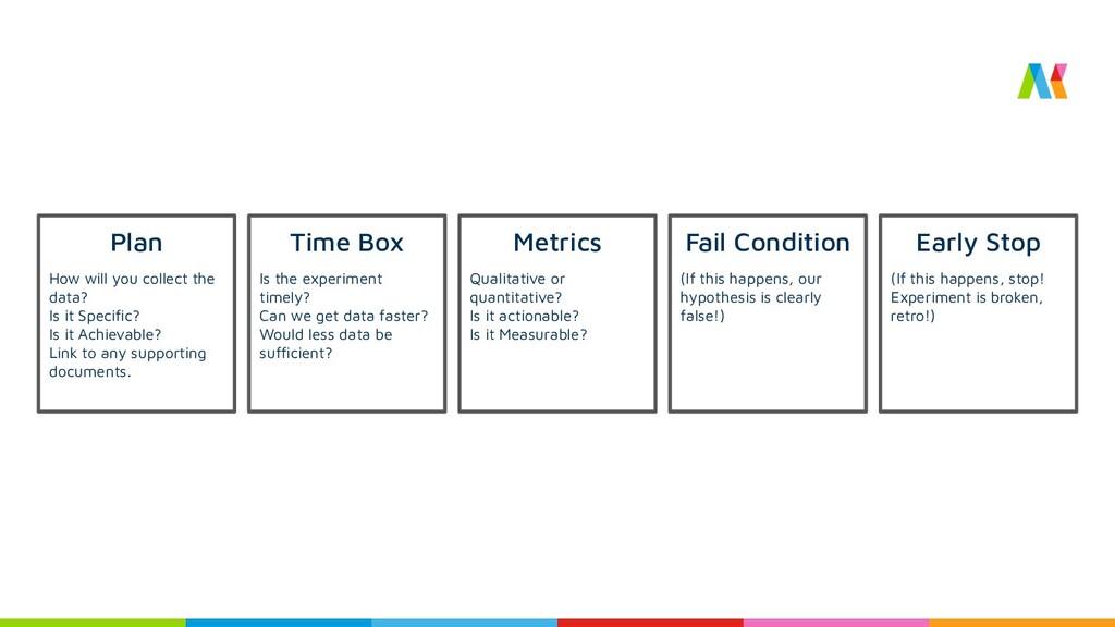 faster? Would less data be sufficient? Metrics Qualitative or quantitative? Is it actionable? Is it Measurable? Fail Condition (If this happens, our hypothesis is clearly false!) Early Stop (If this happens, stop! Experiment is broken, retro!) Plan How will you collect the data? Is it Specific? Is it Achievable? Link to any supporting documents.