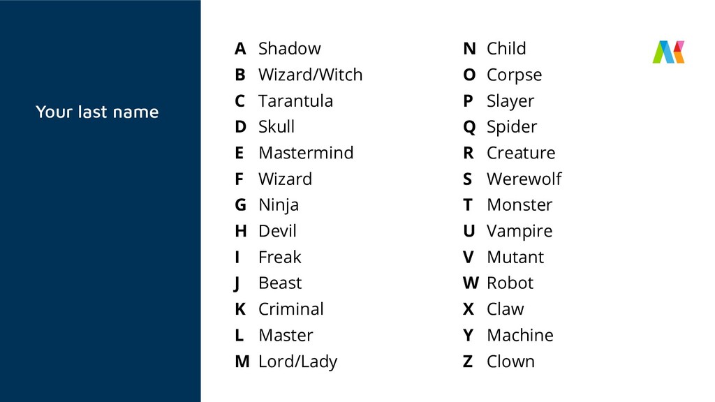 Corpse C Tarantula P Slayer D Skull Q Spider E Mastermind R Creature F Wizard S Werewolf G Ninja T Monster H Devil U Vampire I Freak V Mutant J Beast W Robot K Criminal X Claw L Master Y Machine M Lord/Lady Z Clown