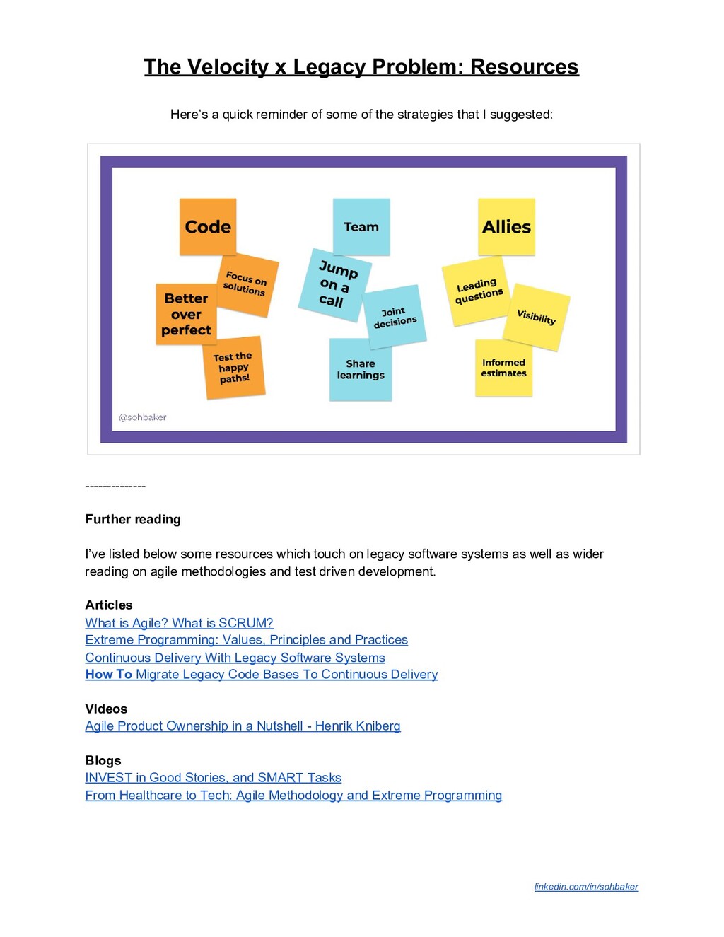 of some of the strategies that I suggested: -------------- Further reading I’ve listed below some resources which touch on legacy software systems as well as wider reading on agile methodologies and test driven development. Articles What is Agile? What is SCRUM? Extreme Programming: Values, Principles and Practices Continuous Delivery With Legacy Software Systems How To Migrate Legacy Code Bases To Continuous Delivery Videos Agile Product Ownership in a Nutshell - Henrik Kniberg Blogs INVEST in Good Stories, and SMART Tasks From Healthcare to Tech: Agile Methodology and Extreme Programming linkedin.com/in/sohbaker