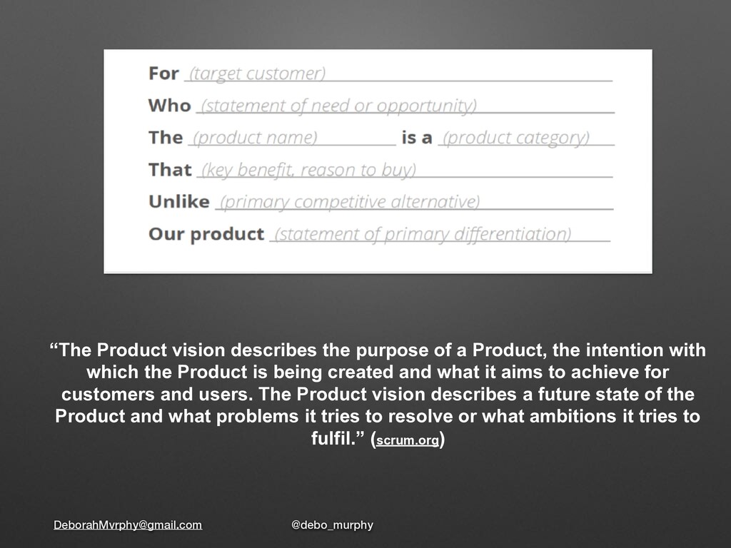 Product, the intention with which the Product is being created and what it aims to achieve for customers and users. The Product vision describes a future state of the Product and what problems it tries to resolve or what ambitions it tries to fulfil.” (scrum.org)