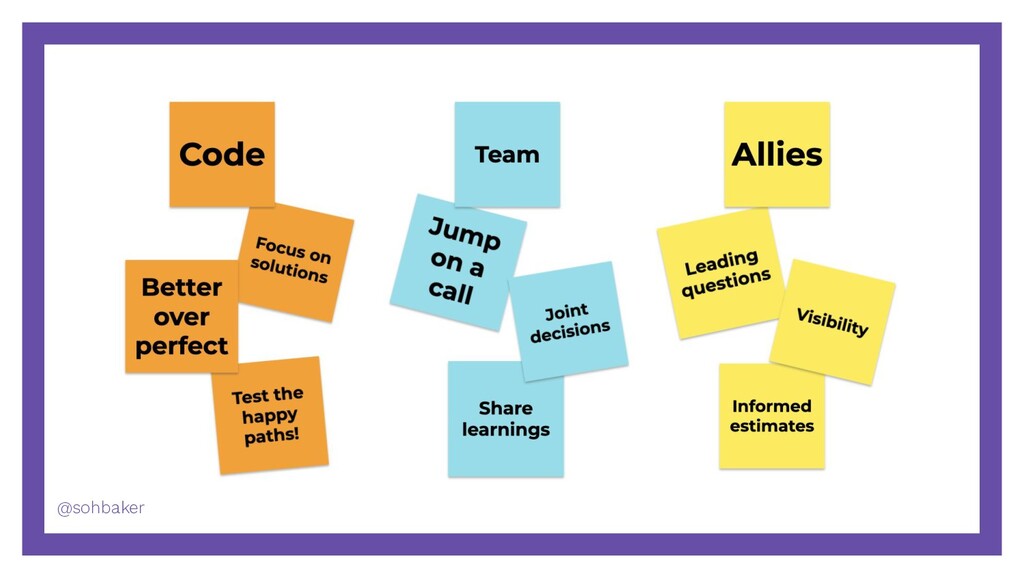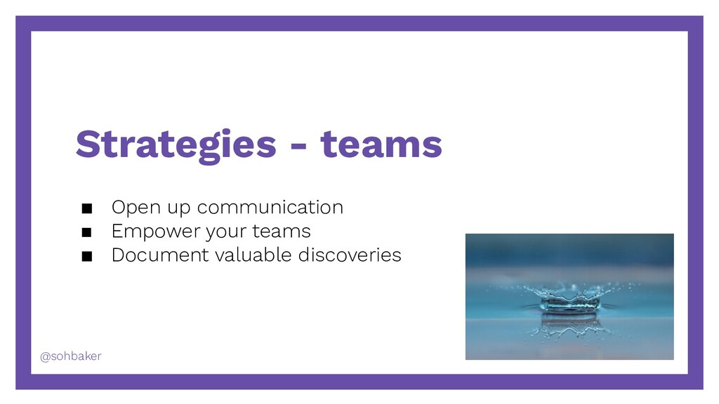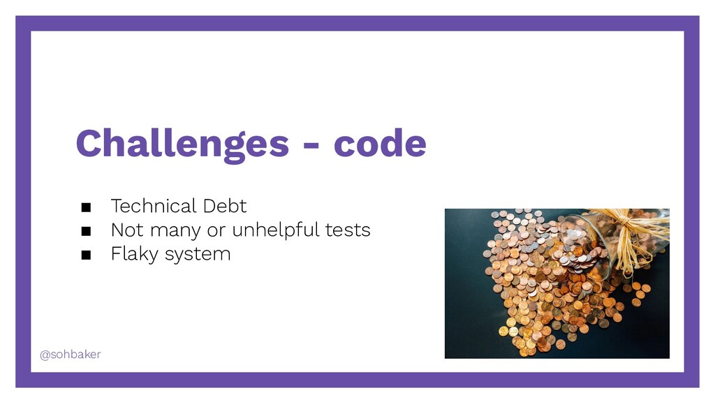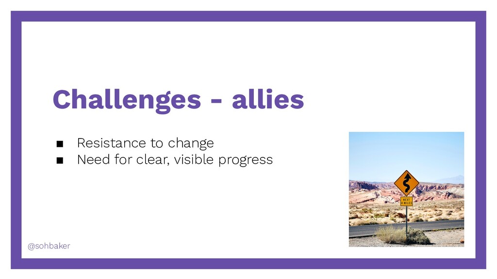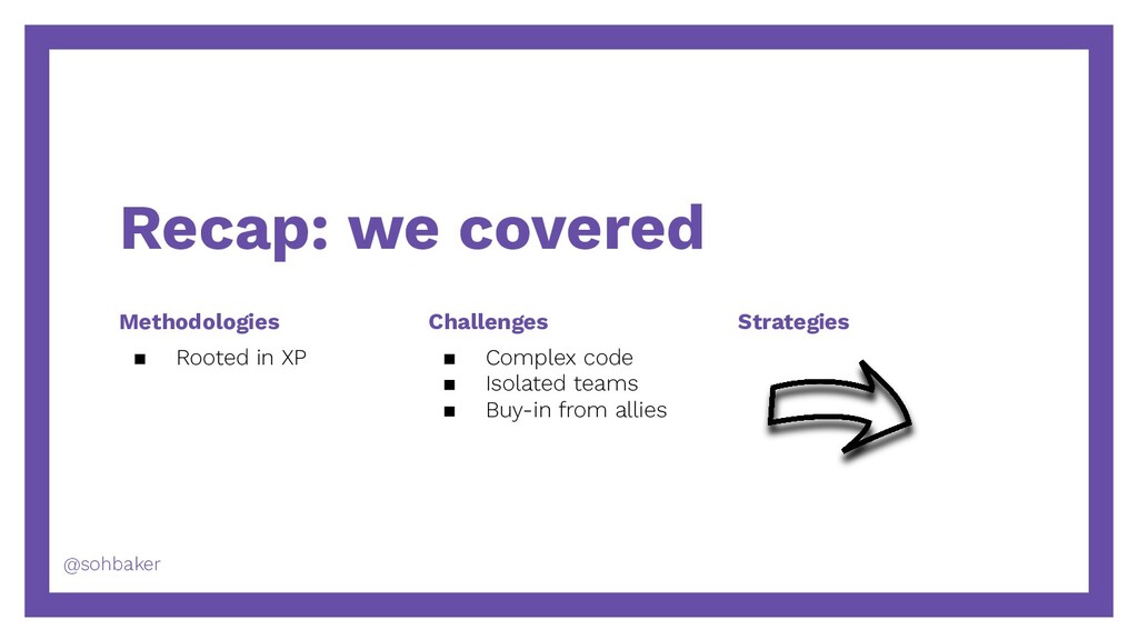 Complex code ▪ Isolated teams ▪ Buy-in from allies Strategies @sohbaker