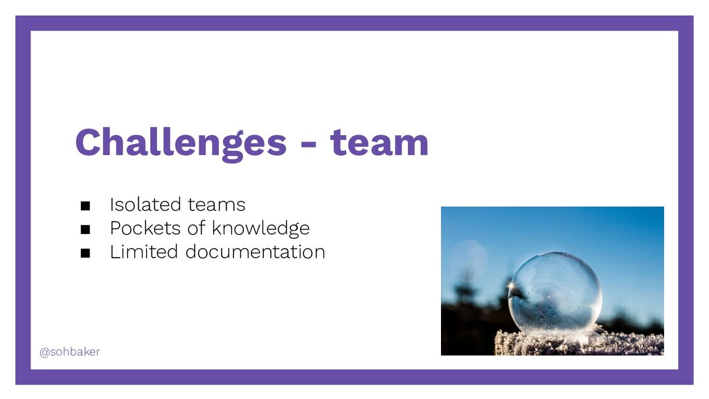 Challenges - team ▪ Isolated teams ▪ Pockets of knowledge