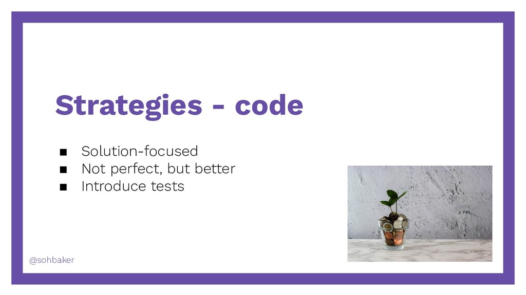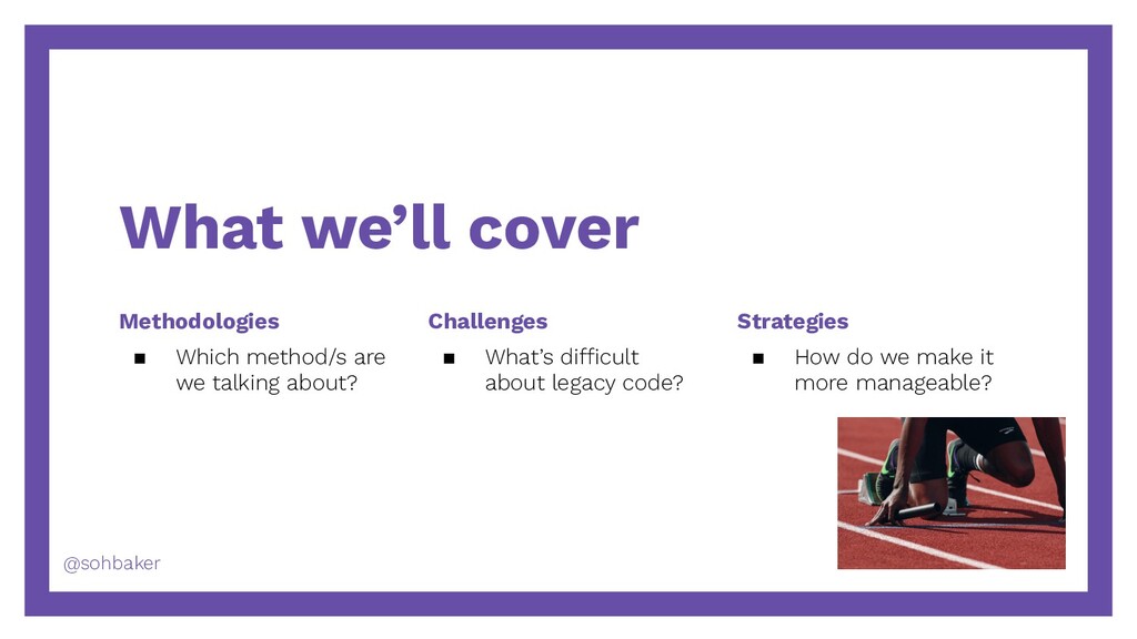 about? Challenges ▪ What’s difficult about legacy code? Strategies ▪ How do we make it more manageable? @sohbaker