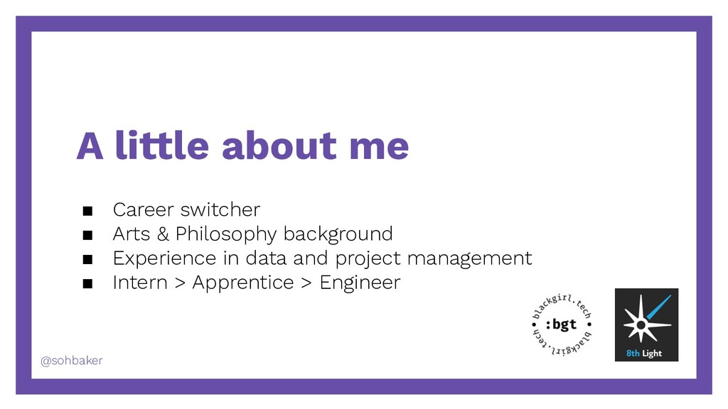 Philosophy background ▪ Experience in data and project management ▪ Intern > Apprentice > Engineer @sohbaker