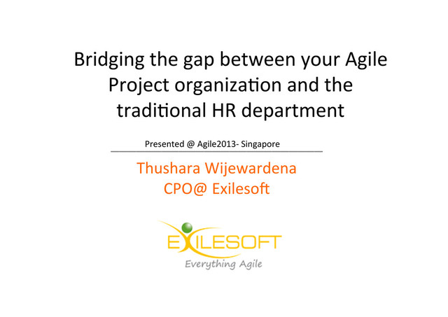 Today, software companies adapt agile concepts for their development teams rapidly. However, the lack of understanding of such concepts by other facilitating entities of the organization including supporting departments , such as HR department, may create complexities and slow down the expected return of such agile transformation by its production staff. Further with current dynamic business climate, the entire organization is challenged to deliver more with less. This session will discuss such challenges in the context as well as the solutions to overcome them.