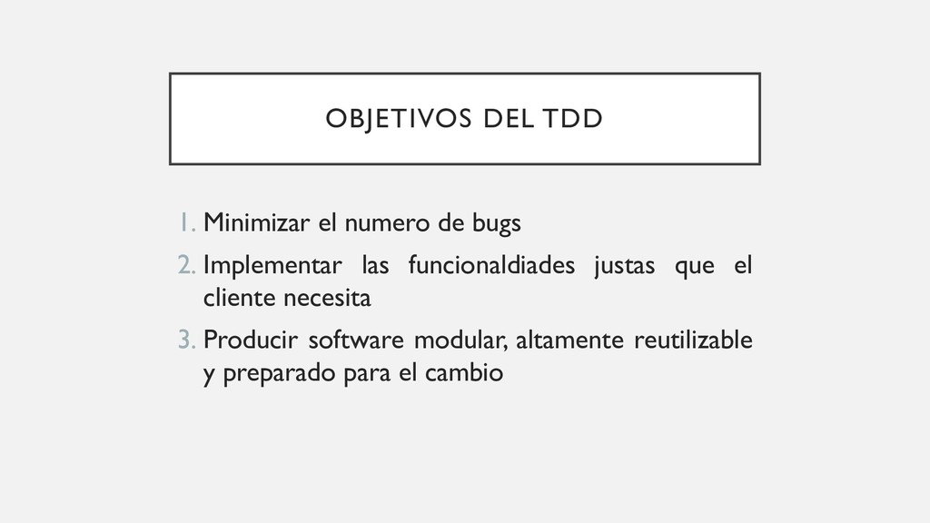 OBJETIVOS DEL TDD 1. Minimizar el numero de bugs 2.