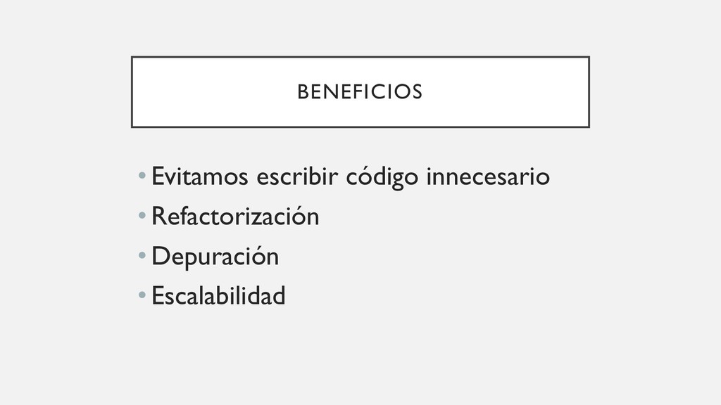 BENEFICIOS • Evitamos escribir código innecesario • Refactorización • Depuración