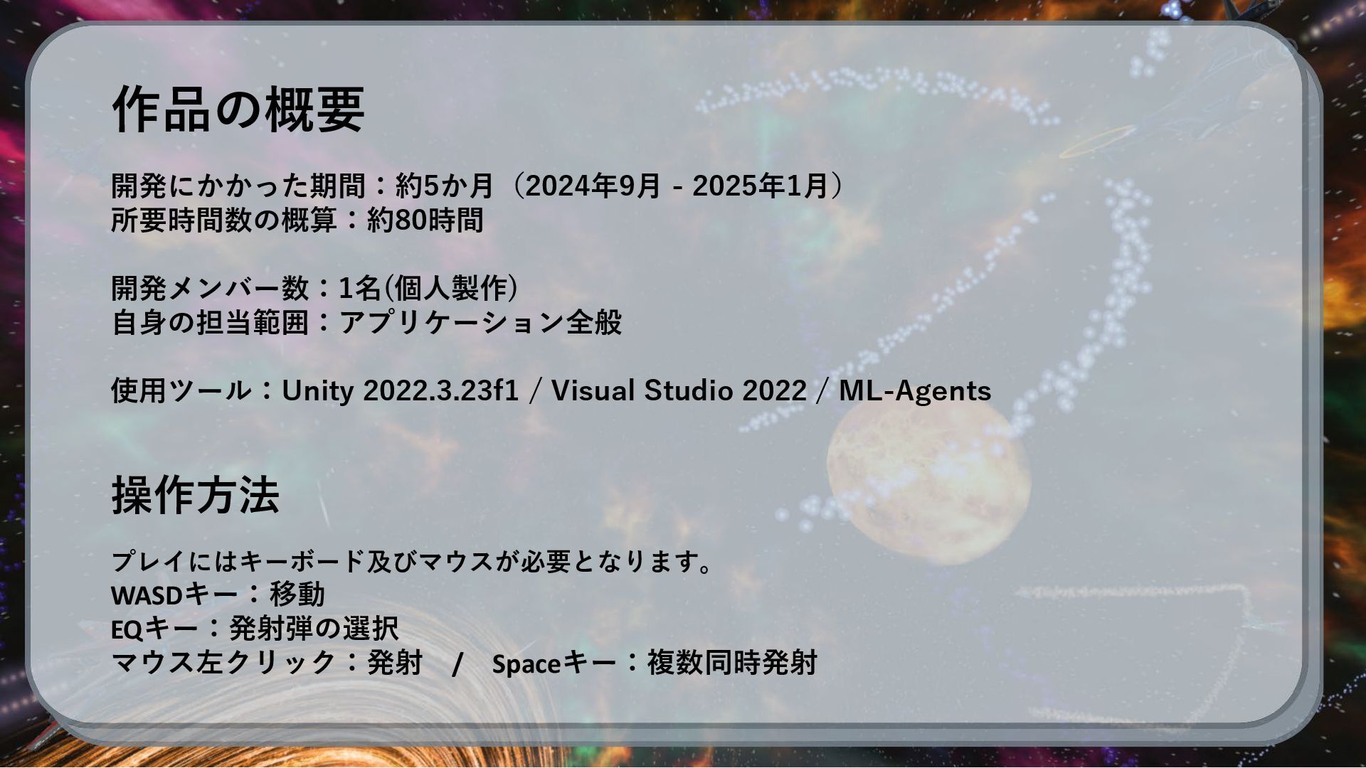 Visual Studio 2022 / ML-Agents 操作方法 プレイにはキーボード及びマウスが必要となります。 WASDキー:移動 EQキー:発射弾の選択 マウス左クリック:発射 / Spaceキー:複数同時発射
