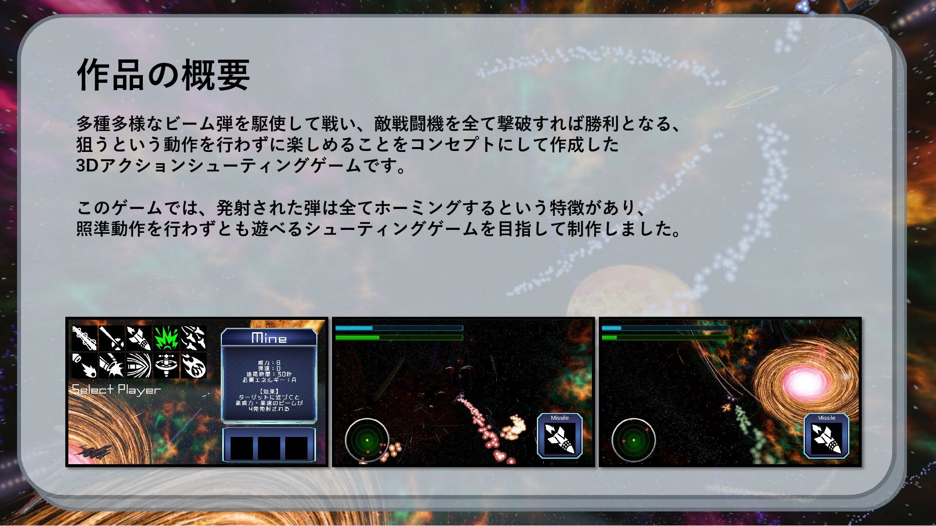作品の概要 多種多様なビーム弾を駆使して戦い、敵戦闘機を全て撃破すれば勝利となる、 狙うという動作を行わずに楽しめることをコンセプトにして作成した 3Dアクションシューティングゲームです。 このゲームでは、発射された弾は全てホーミングするという特徴があり、 照準動作を行わずとも遊べるシューティングゲームを目指して制作しました。