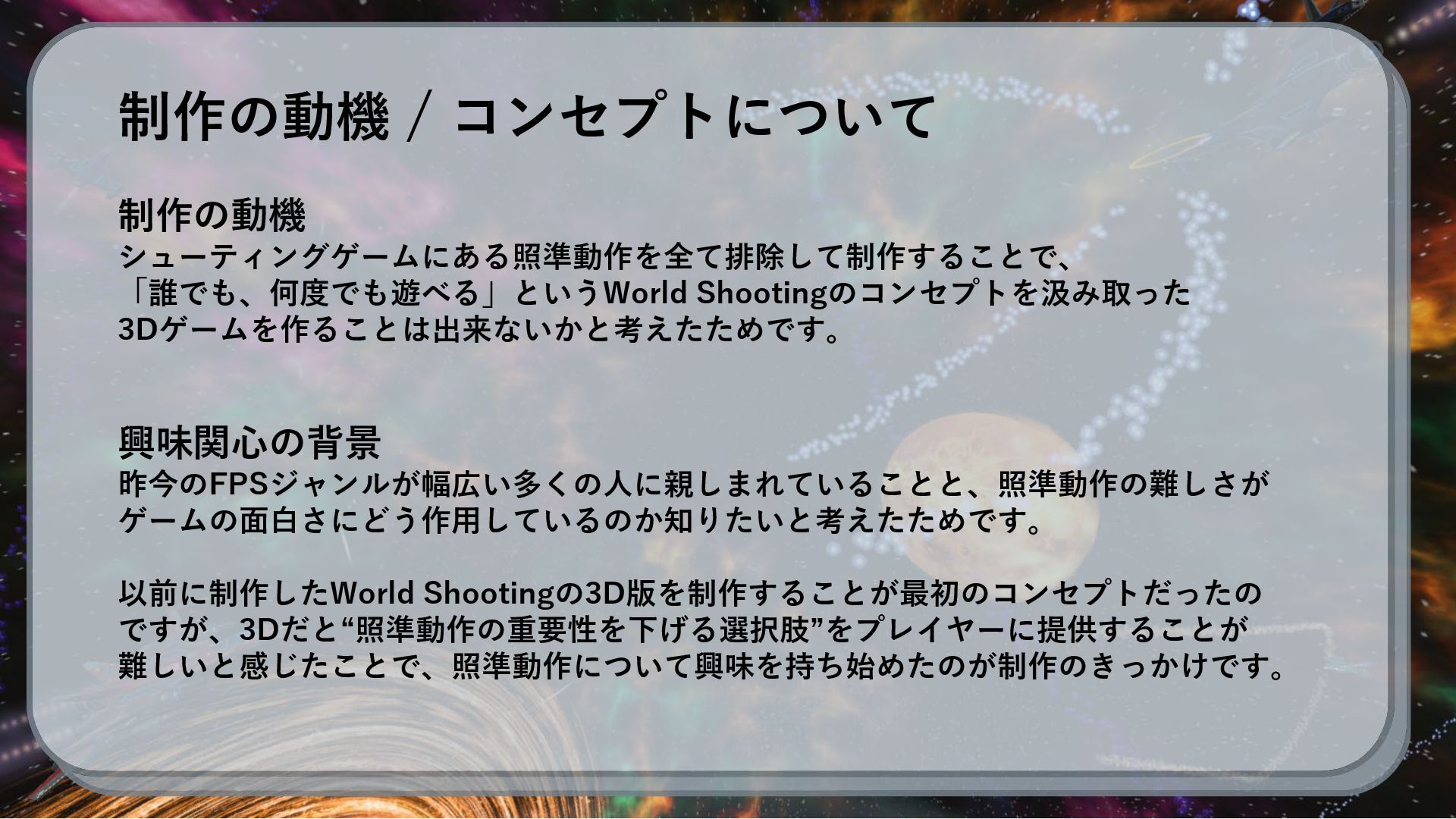 制作の動機 / コンセプトについて 制作の動機 シューティングゲームにある照準動作を全て排除して制作することで、 「誰でも、何度でも遊べる」というWorld Shootingのコンセプトを汲み取った 3Dゲームを作ることは出来ないかと考えたためです。 興味関心の背景 昨今のFPSジャンルが幅広い多くの人に親しまれていることと、照準動作の難しさが