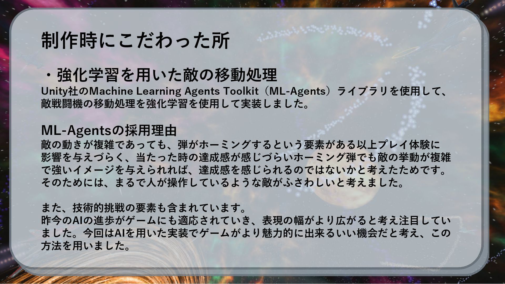 制作時にこだわった所 ・強化学習を用いた敵の移動処理 Unity社のMachine Learning Agents Toolkit(ML-Agents)ライブラリを使用して、 敵戦闘機の移動処理を強化学習を使用して実装しました。 ML-Agentsの採用理由 敵の動きが複雑であっても、弾がホーミングするという要素がある以上プレイ体験に 影響を与えづらく、当たった時の達成感が感じづらいホーミング弾でも敵の挙動が複雑