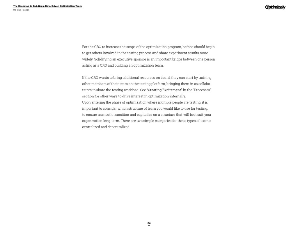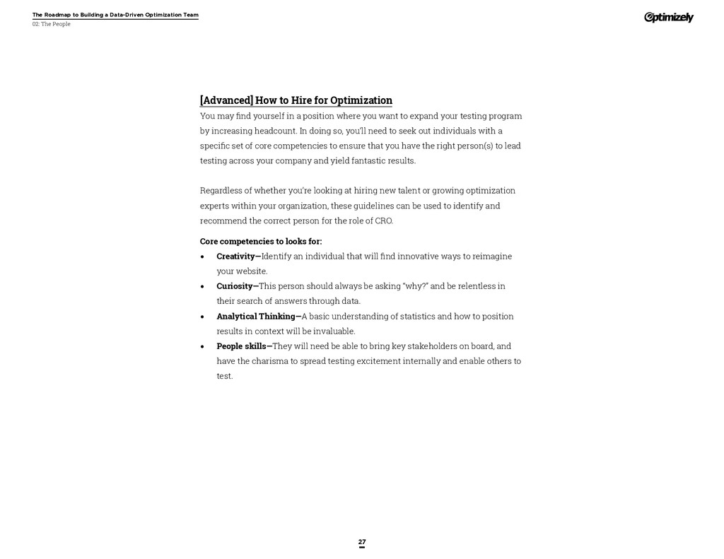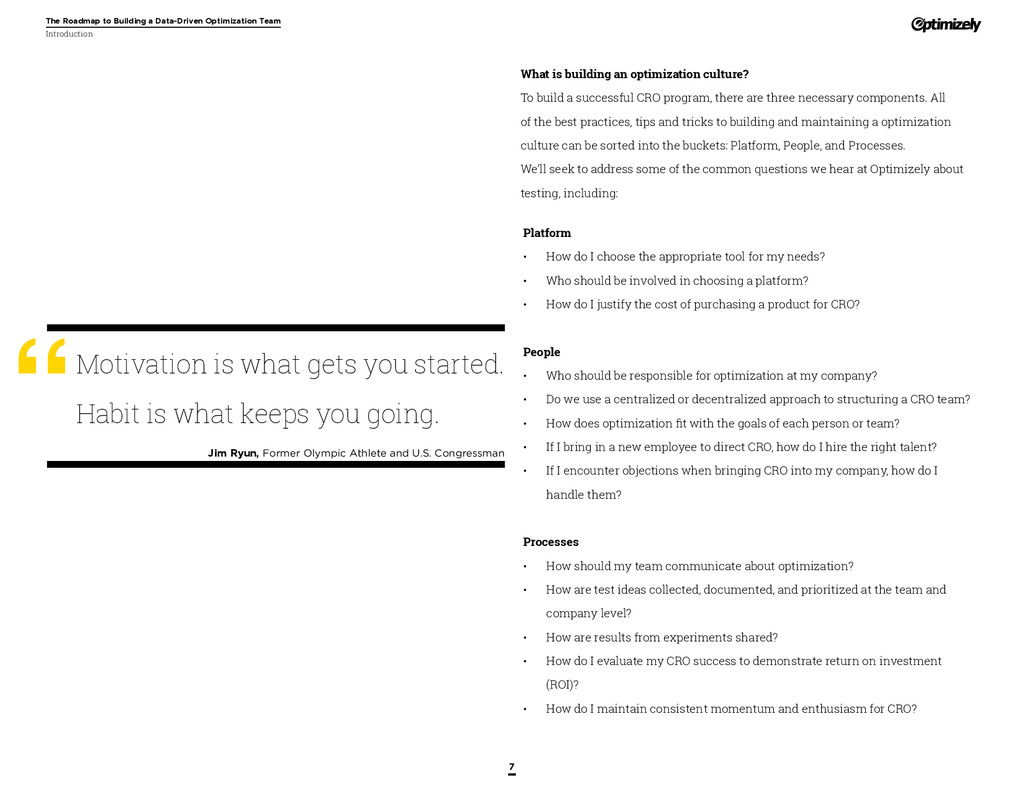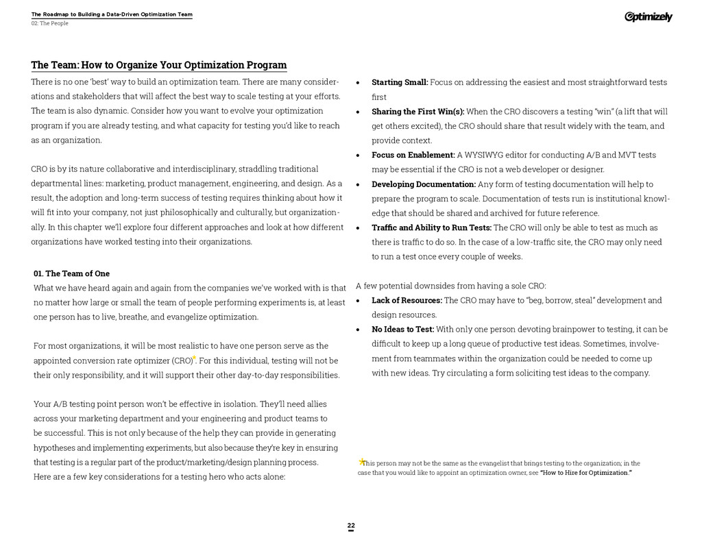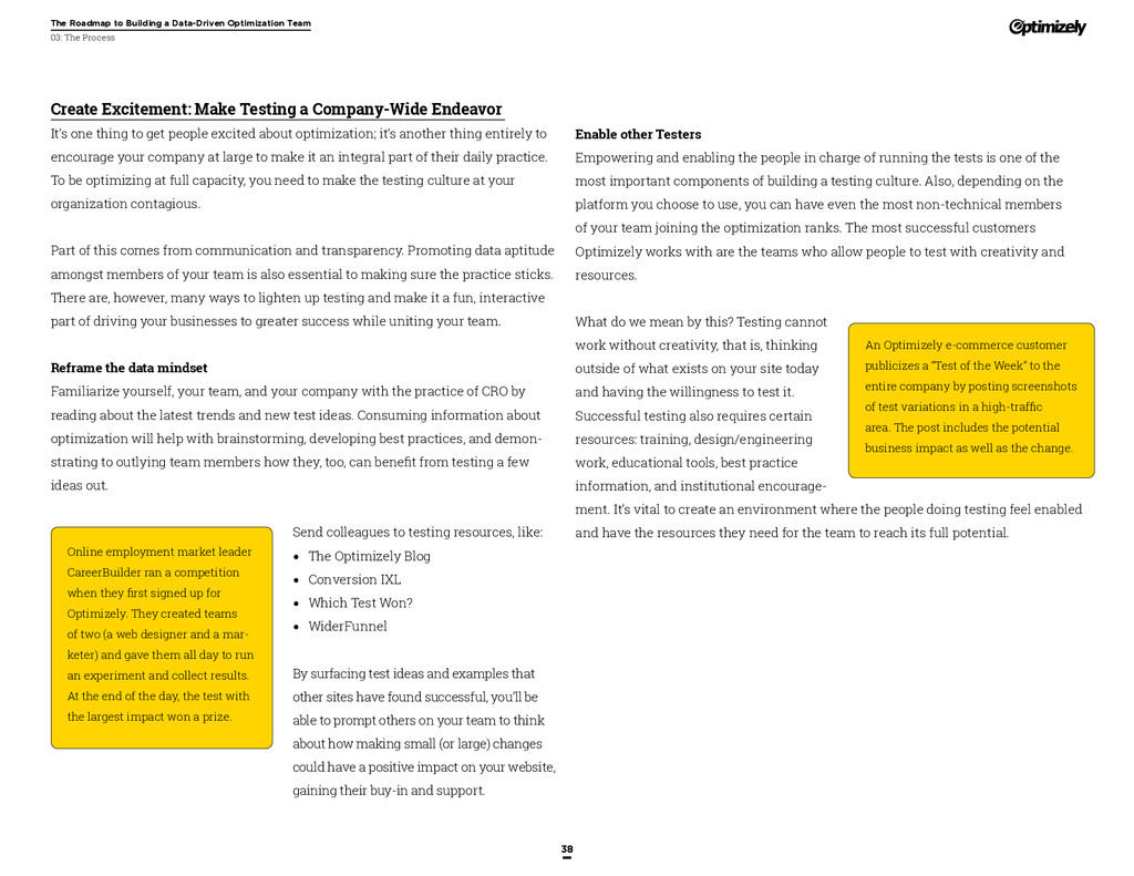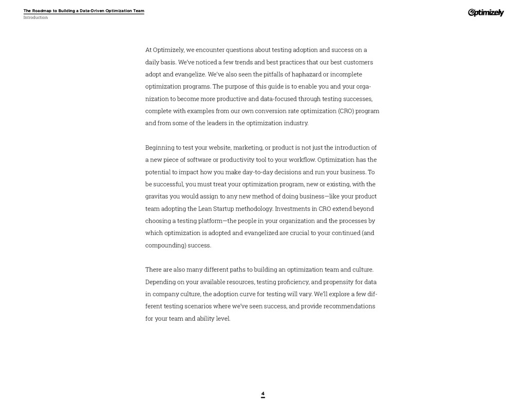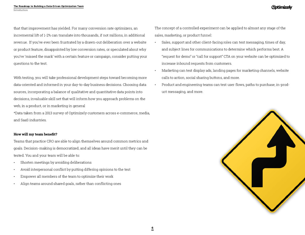 that that improvement has yielded. For many conversion rate optimizers, an incremental lift of 1-2% can translate into thousands, if not millions, in additional revenue. If you’ve ever been frustrated by a drawn-out deliberation over a website or product feature, disappointed by low conversion rates, or speculated about why you’ve ‘missed the mark’ with a certain feature or campaign, consider putting your questions to the test. With testing, you will take professional development steps toward becoming more data-oriented and informed in your day-to-day business decisions. Choosing data sources, incorporating a balance of qualitative and quantitative data points into decisions, invaluable skill set that will inform how you approach problems on the web, in a product, or in marketing in general *Data taken from a 2013 survey of Optimizely customers across e-commerce, media, and SaaS industries. How will my team benefit? Teams that practice CRO are able to align themselves around common metrics and goals. Decision-making is democratized, and all ideas have merit until they can be tested. You and your team will be able to: • Shorten meetings by avoiding deliberations • Avoid interpersonal conflict by putting differing opinions to the test • Empower all members of the team to optimize their work • Align teams around shared goals, rather than conflicting ones The concept of a controlled experiment can be applied to almost any stage of the sales, marketing, or product funnel: • Sales, support and other client-facing roles can test messaging, times of day, and subject lines for communications to determine which performs best. A “request for demo” or “call for support” CTA on your website can be optimized to increase inbound requests from customers. • Marketing can test display ads, landing pages for marketing channels, website calls to action, social sharing buttons, and more. • Product and engineering teams can test user flows, paths to purchase, in-prod- uct messaging, and more.