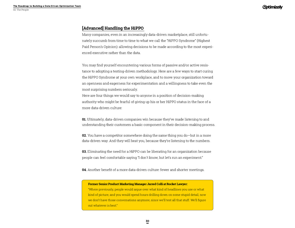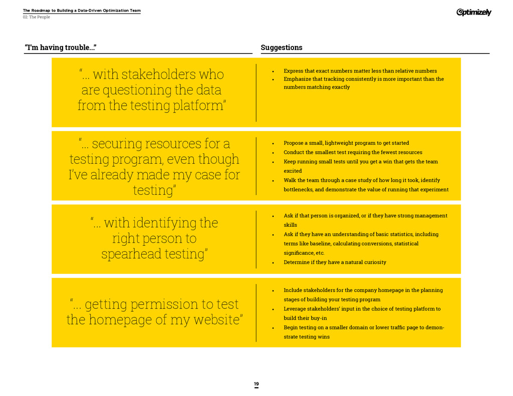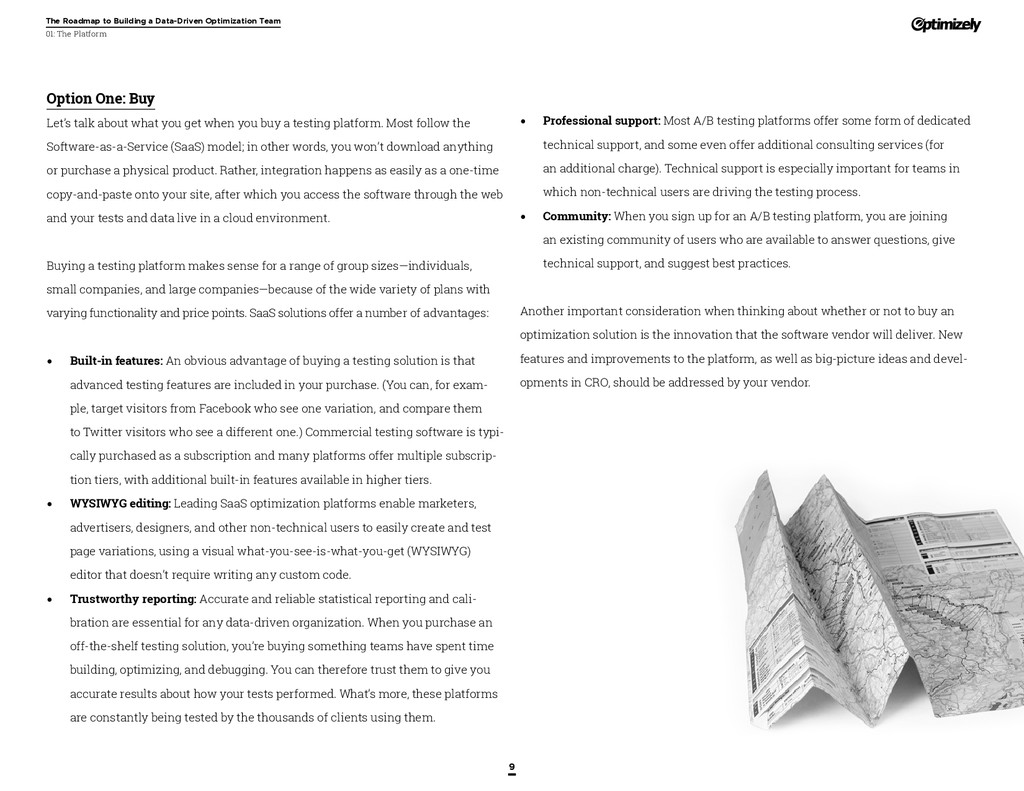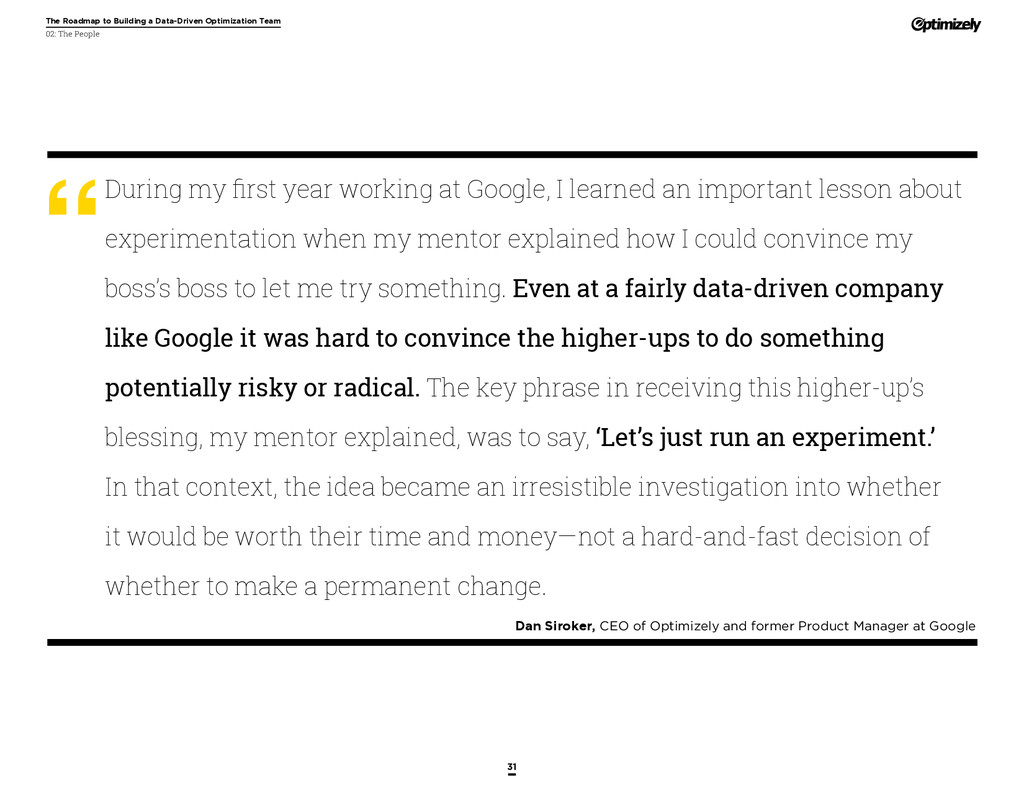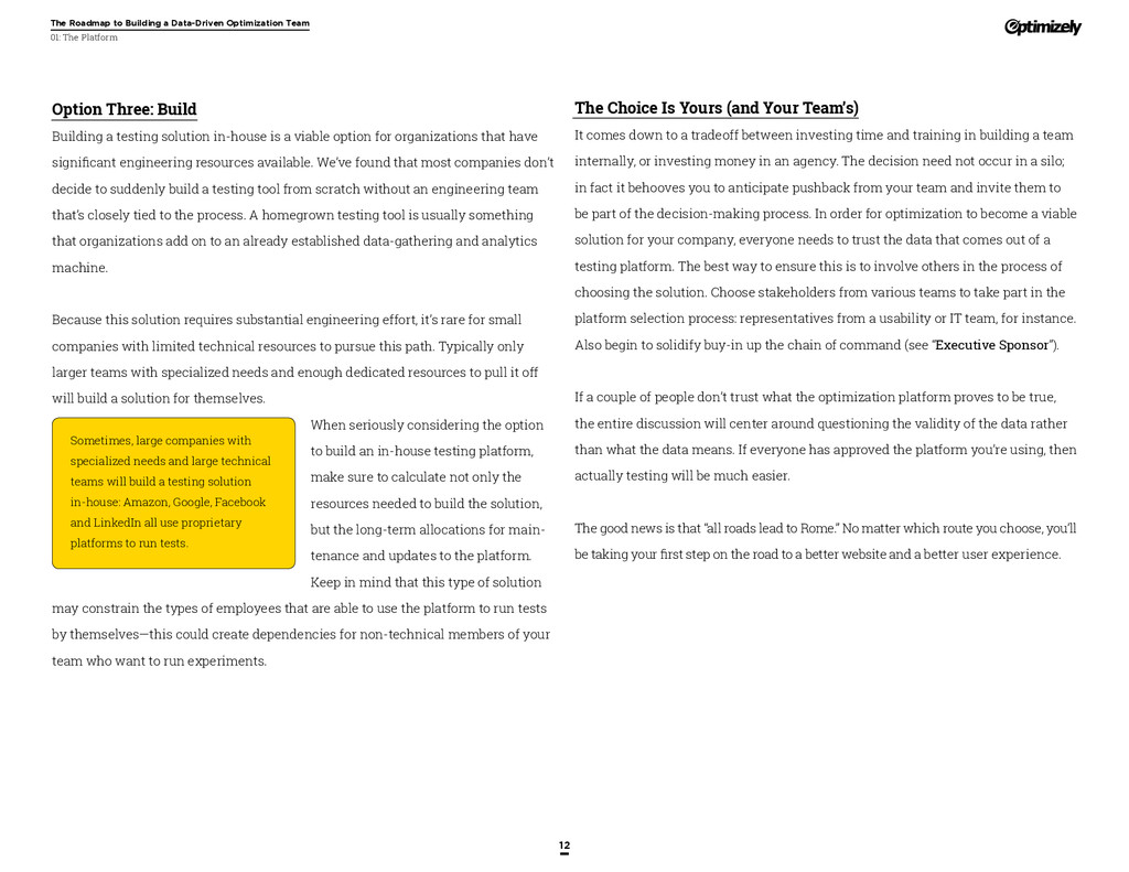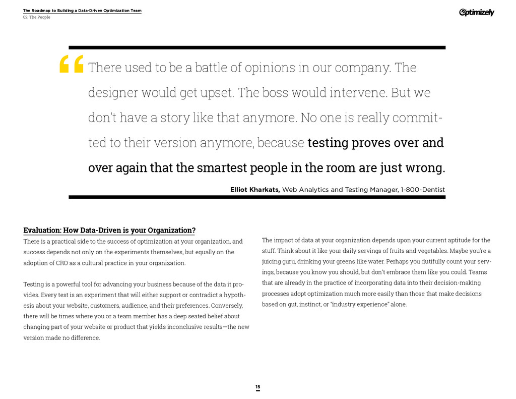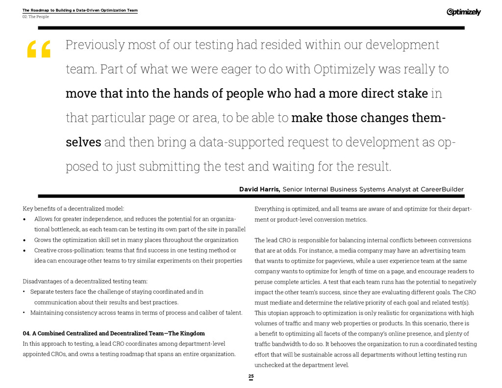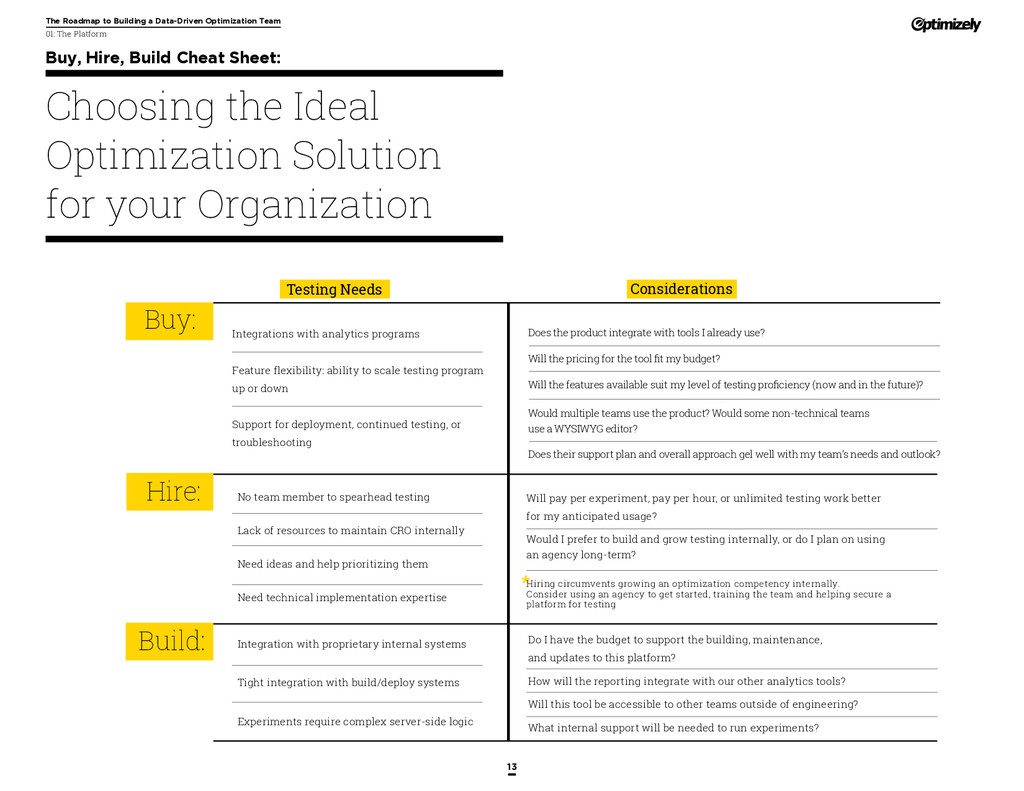 that that improvement has yielded. For many conversion rate optimizers, an incremental lift of 1-2% can translate into thousands, if not millions, in additional revenue. If you’ve ever been frustrated by a drawn-out deliberation over a website or product feature, disappointed by low conversion rates, or speculated about why you’ve ‘missed the mark’ with a certain feature or campaign, consider putting your questions to the test. With testing, you will take professional development steps toward becoming more data-oriented and informed in your day-to-day business decisions. Choosing data sources, incorporating a balance of qualitative and quantitative data points into decisions, invaluable skill set that will inform how you approach problems on the web, in a product, or in marketing in general *Data taken from a 2013 survey of Optimizely customers across e-commerce, media, and SaaS industries. How will my team benefit? Teams that practice CRO are able to align themselves around common metrics and goals. Decision-making is democratized, and all ideas have merit until they can be tested. You and your team will be able to: • Shorten meetings by avoiding deliberations • Avoid interpersonal conflict by putting differing opinions to the test • Empower all members of the team to optimize their work • Align teams around shared goals, rather than conflicting ones The concept of a controlled experiment can be applied to almost any stage of the sales, marketing, or product funnel: • Sales, support and other client-facing roles can test messaging, times of day, and subject lines for communications to determine which performs best. A “request for demo” or “call for support” CTA on your website can be optimized to increase inbound requests from customers. • Marketing can test display ads, landing pages for marketing channels, website calls to action, social sharing buttons, and more. • Product and engineering teams can test user flows, paths to purchase, in-prod- uct messaging, and more.