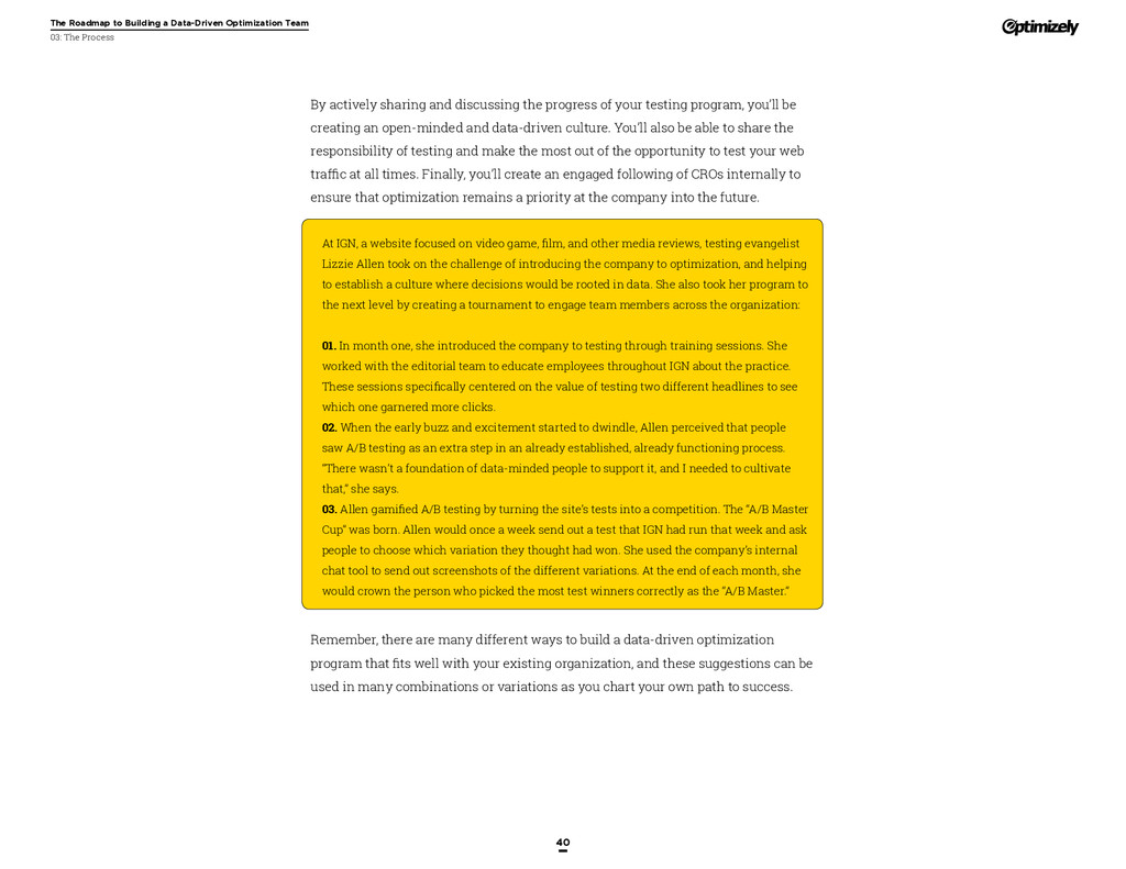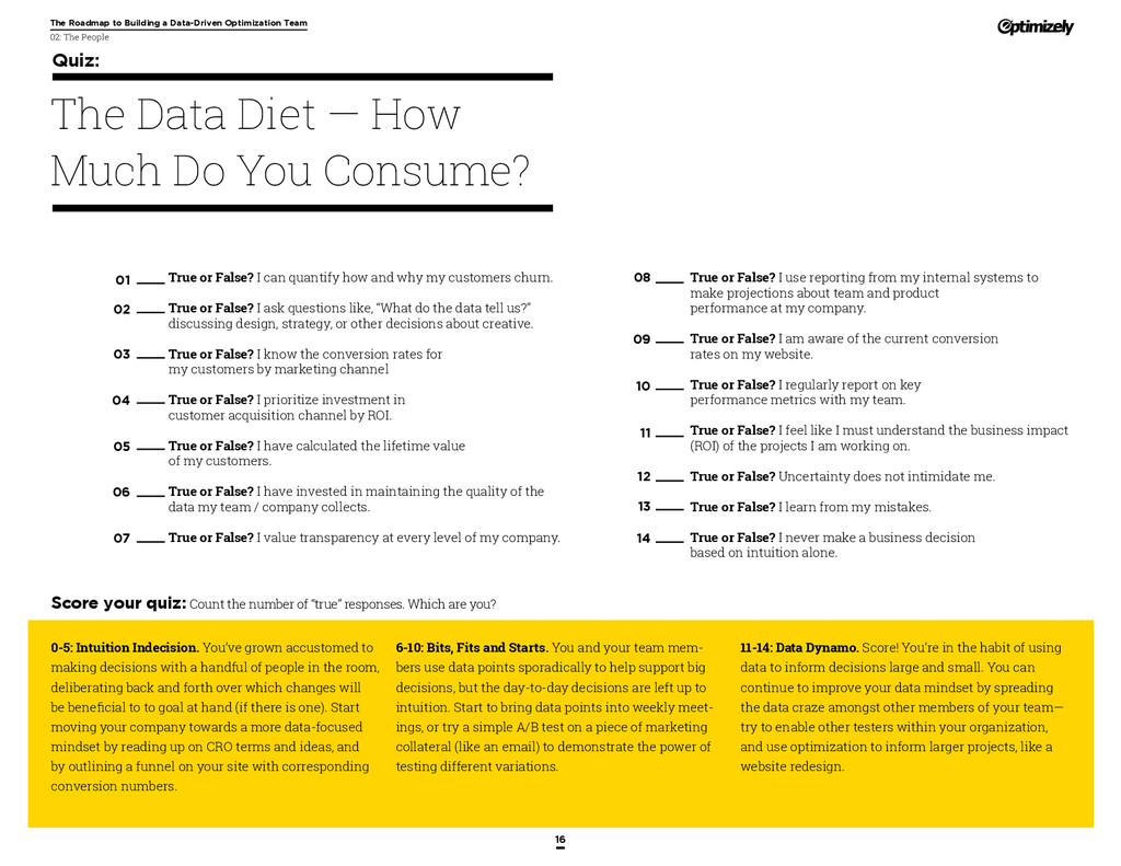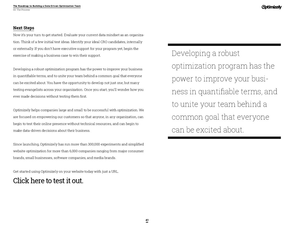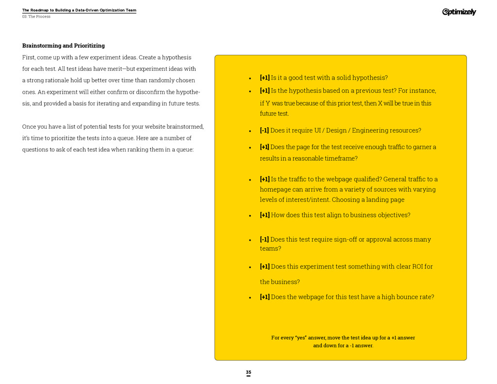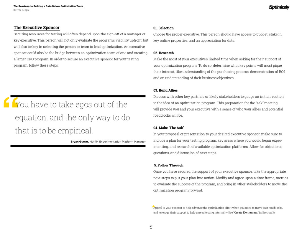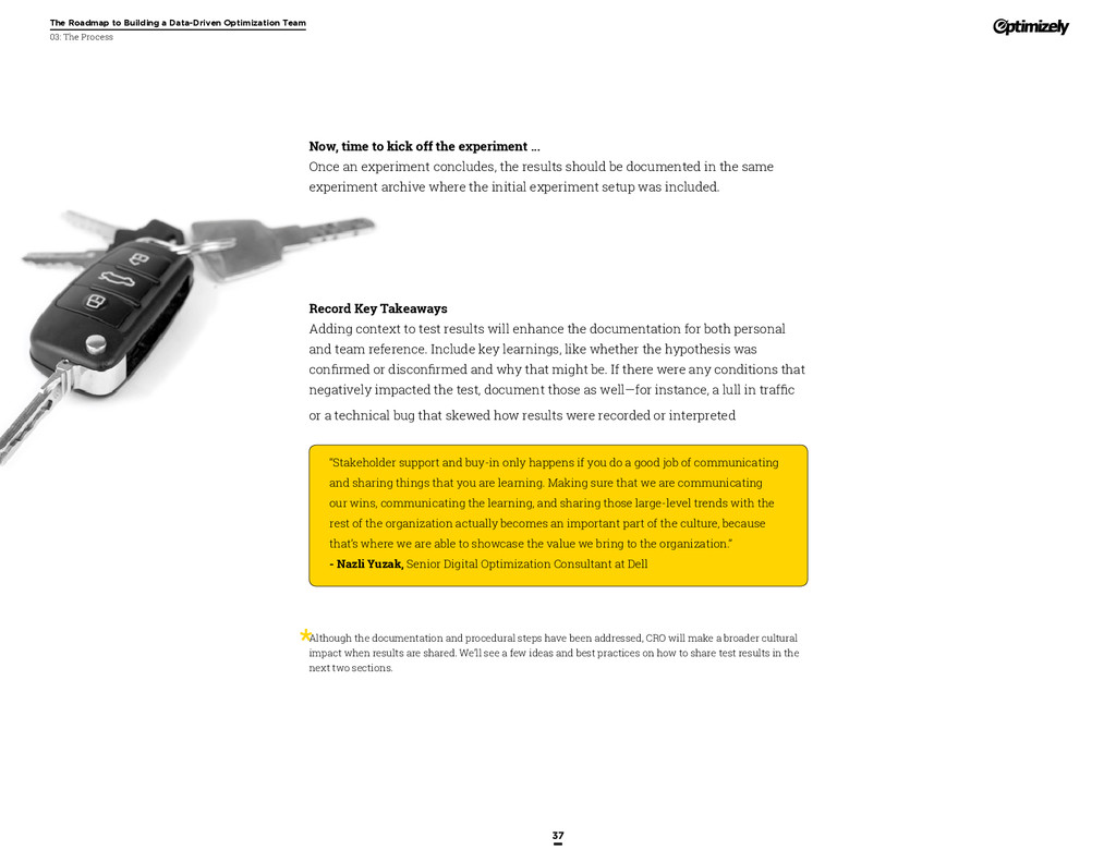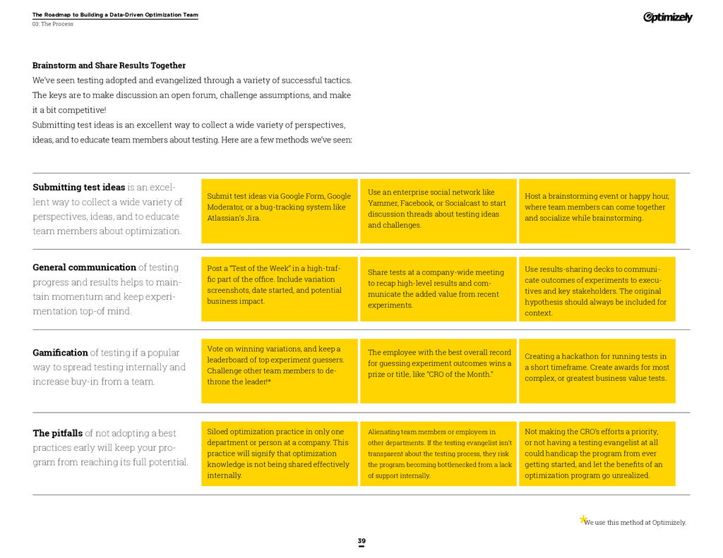 that that improvement has yielded. For many conversion rate optimizers, an incremental lift of 1-2% can translate into thousands, if not millions, in additional revenue. If you’ve ever been frustrated by a drawn-out deliberation over a website or product feature, disappointed by low conversion rates, or speculated about why you’ve ‘missed the mark’ with a certain feature or campaign, consider putting your questions to the test. With testing, you will take professional development steps toward becoming more data-oriented and informed in your day-to-day business decisions. Choosing data sources, incorporating a balance of qualitative and quantitative data points into decisions, invaluable skill set that will inform how you approach problems on the web, in a product, or in marketing in general *Data taken from a 2013 survey of Optimizely customers across e-commerce, media, and SaaS industries. How will my team benefit? Teams that practice CRO are able to align themselves around common metrics and goals. Decision-making is democratized, and all ideas have merit until they can be tested. You and your team will be able to: • Shorten meetings by avoiding deliberations • Avoid interpersonal conflict by putting differing opinions to the test • Empower all members of the team to optimize their work • Align teams around shared goals, rather than conflicting ones The concept of a controlled experiment can be applied to almost any stage of the sales, marketing, or product funnel: • Sales, support and other client-facing roles can test messaging, times of day, and subject lines for communications to determine which performs best. A “request for demo” or “call for support” CTA on your website can be optimized to increase inbound requests from customers. • Marketing can test display ads, landing pages for marketing channels, website calls to action, social sharing buttons, and more. • Product and engineering teams can test user flows, paths to purchase, in-prod- uct messaging, and more.