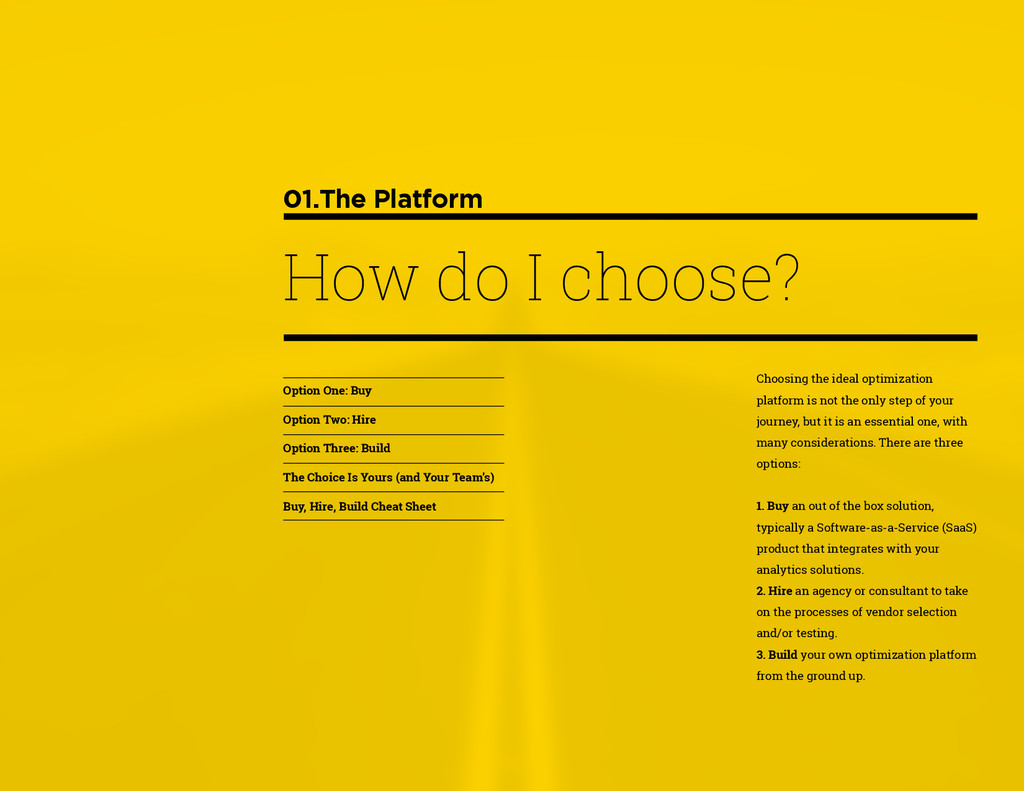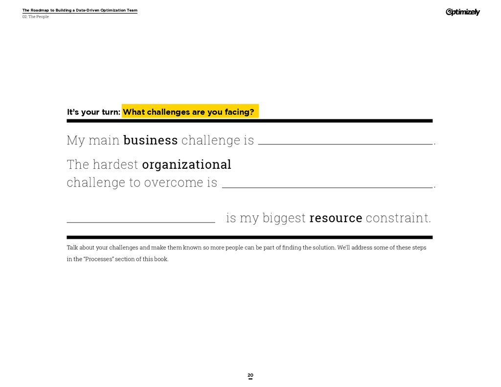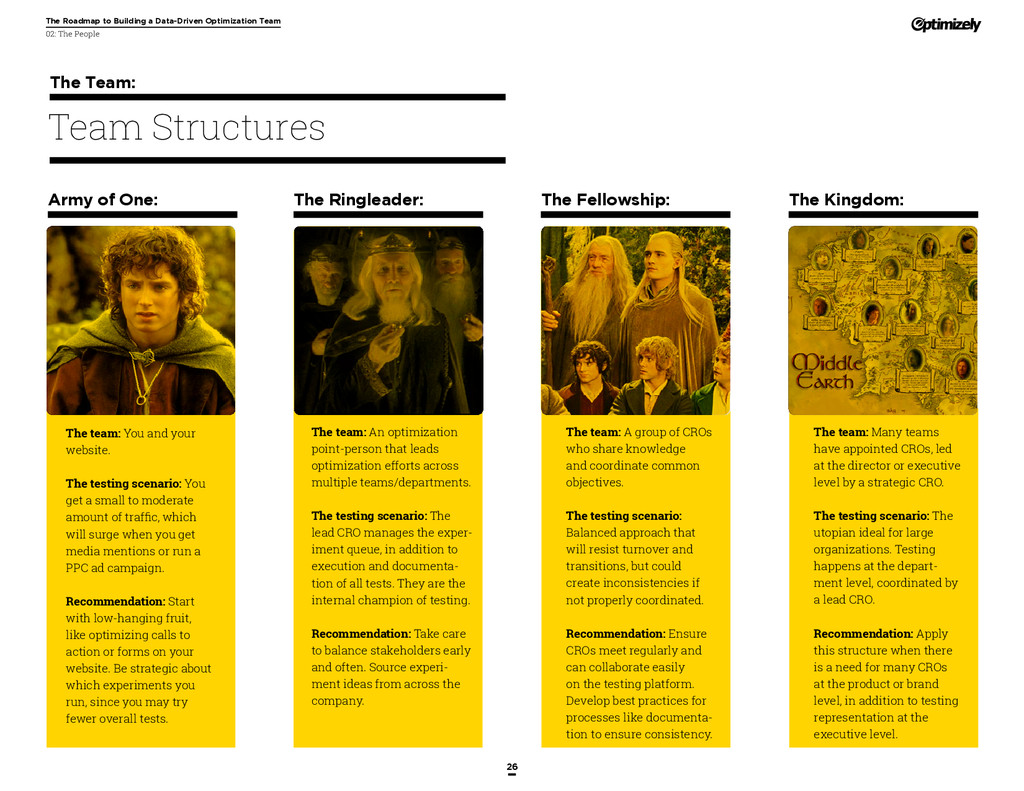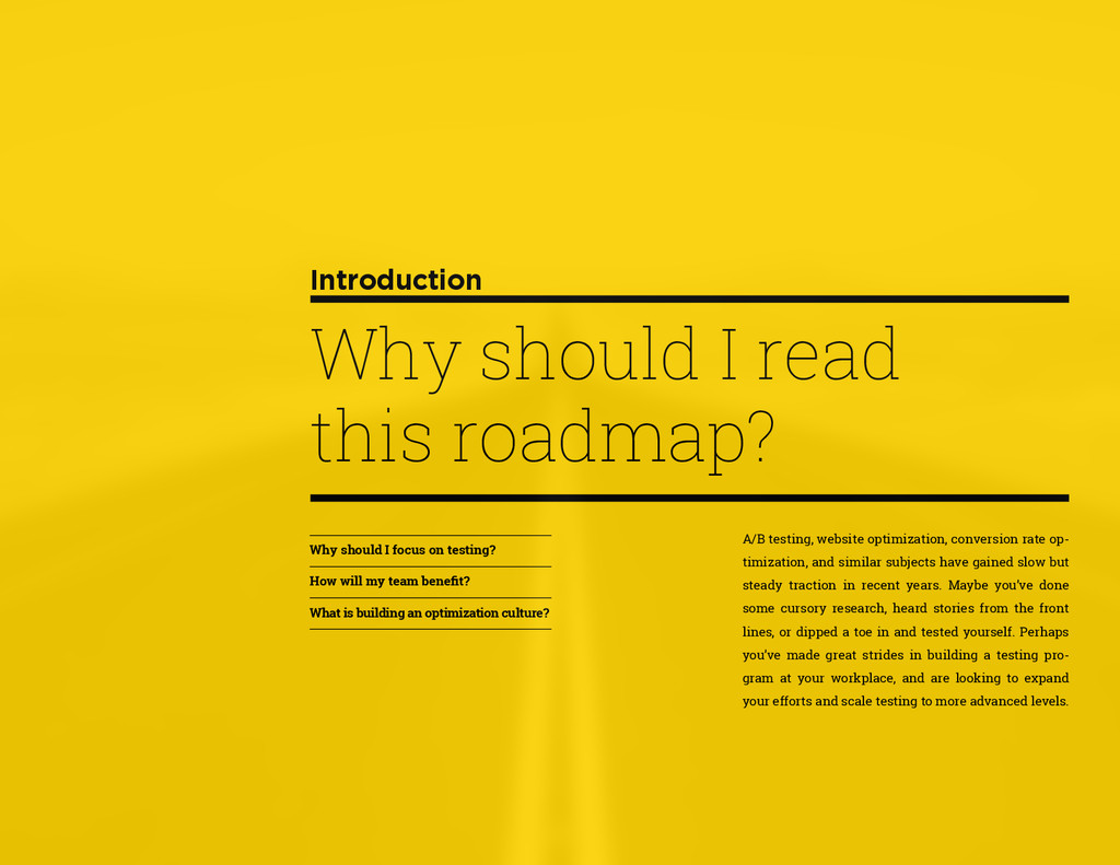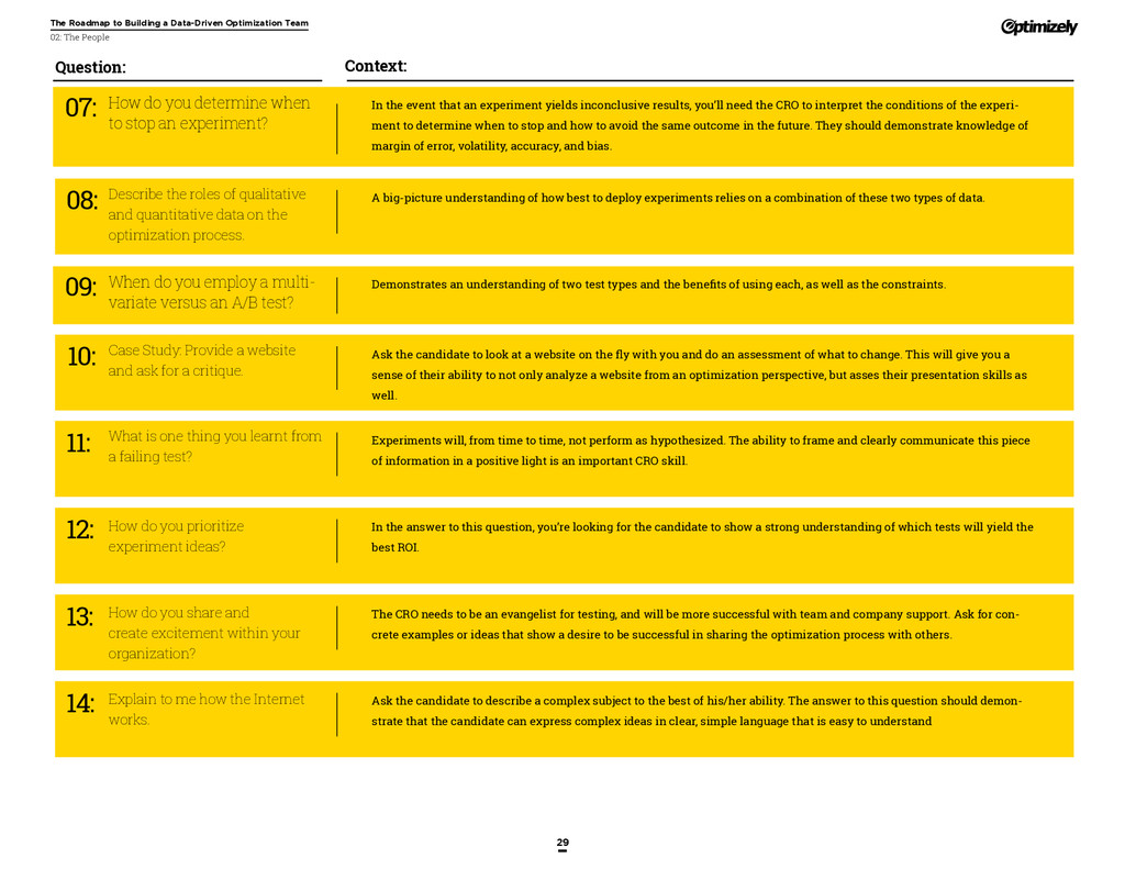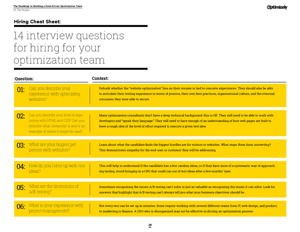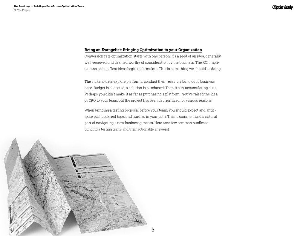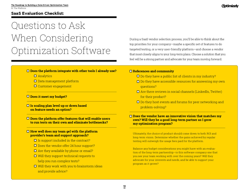 that that improvement has yielded. For many conversion rate optimizers, an incremental lift of 1-2% can translate into thousands, if not millions, in additional revenue. If you’ve ever been frustrated by a drawn-out deliberation over a website or product feature, disappointed by low conversion rates, or speculated about why you’ve ‘missed the mark’ with a certain feature or campaign, consider putting your questions to the test. With testing, you will take professional development steps toward becoming more data-oriented and informed in your day-to-day business decisions. Choosing data sources, incorporating a balance of qualitative and quantitative data points into decisions, invaluable skill set that will inform how you approach problems on the web, in a product, or in marketing in general *Data taken from a 2013 survey of Optimizely customers across e-commerce, media, and SaaS industries. How will my team benefit? Teams that practice CRO are able to align themselves around common metrics and goals. Decision-making is democratized, and all ideas have merit until they can be tested. You and your team will be able to: • Shorten meetings by avoiding deliberations • Avoid interpersonal conflict by putting differing opinions to the test • Empower all members of the team to optimize their work • Align teams around shared goals, rather than conflicting ones The concept of a controlled experiment can be applied to almost any stage of the sales, marketing, or product funnel: • Sales, support and other client-facing roles can test messaging, times of day, and subject lines for communications to determine which performs best. A “request for demo” or “call for support” CTA on your website can be optimized to increase inbound requests from customers. • Marketing can test display ads, landing pages for marketing channels, website calls to action, social sharing buttons, and more. • Product and engineering teams can test user flows, paths to purchase, in-prod- uct messaging, and more.