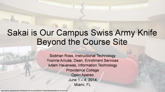Site Siobhan Ross, Instructional Technology Yvonne Arruda, Dean, Enrollment Services Adam Hauerwas, Information Technology Providence College Open Apereo June 1 – 4, 2014 Miami, FL http://media.npr.org/assets/img/2011/09/30/ap8612161144_slide-9f5584391c17023b9455fb565e9958663ce01cc5-s6-c30.jpg