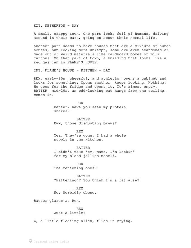 town. One part looks full of humans, driving around in their cars, going on about their normal life. Another part seems to have houses that are a mixture of human houses, but looking more unkempt, some are even abandoned or made out of weird materials like cardboard boxes or milk cartons. On that part of town, a building that looks like a red gas can is FLAME'S HOUSE. INT. FLAME'S HOUSE - KITCHEN - DAY REX, early-20s, cheerful, and athletic, opens a cabinet and looks for something. Opens another, keeps looking. Nothing. He goes for the fridge and opens it. It's almost empty. BATTER, mid-20s, an odd-looking bat hangs from the ceiling, comes in. REX Batter, have you seen my protein shakes? BATTER Eww, those disgusting brews? REX Yea. They're gone. I had a whole supply in the kitchen. BATTER I didn't take 'em, mate. I'm lookin' for my blood jellies meself. REX The fattening ones? BATTER "Fattening"? You think I'm a fat arse? REX No. Morbidly obese. Batter glares at Rex. REX Just a little? Z, a little floating alien, flies in crying.
